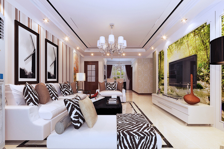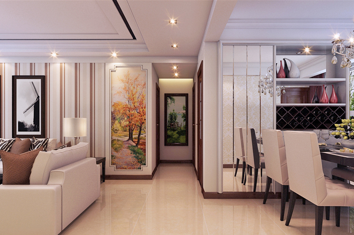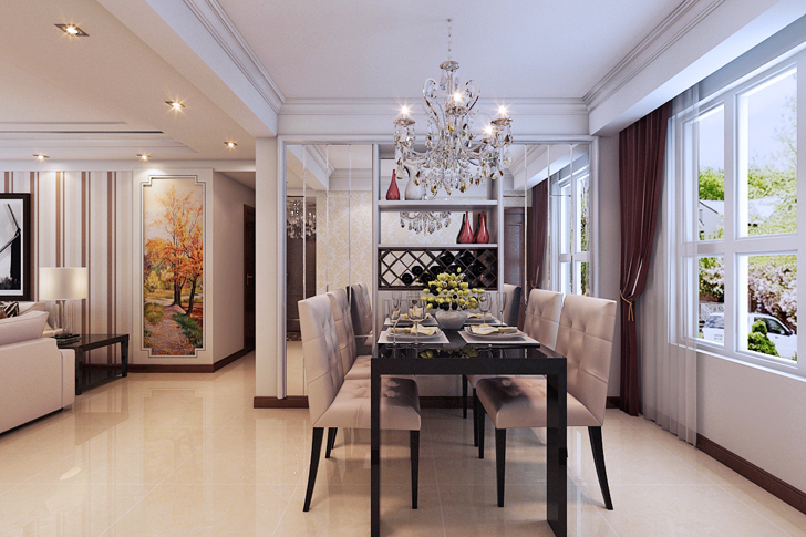 定位于简欧风格,力求营造出一种使空间尽情挥洒源远流长的神韵。在给予空间生命力的同时也饱含文化情趣。选材方面,欧式惯用的白色材质外,还用了壁画、镜面等现代材料,大大提升了原质感的对比效果,在表现尊贵的同时还增添了几分现代感,本案配搭了暖色的灯光,使得空间的层次感,穿透性大大提高。家具等也很讲究,既有西式元素,又具有强烈的时代感元素。例如天花水晶灯的闪烁效果,搭配上水晶灯、镜面、挂画、饰品等完美组合,形成极具品味的装饰效果,将奢华的欧式风情演绎的淋漓尽致。