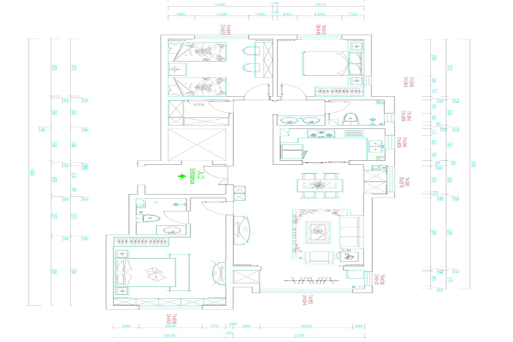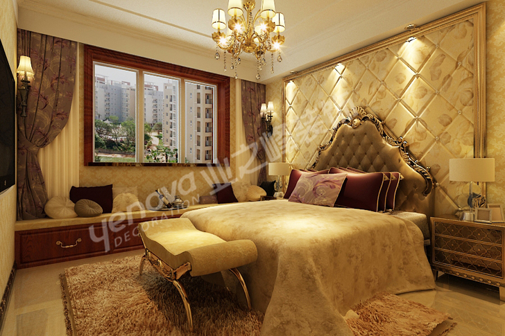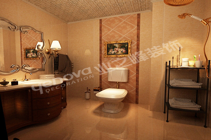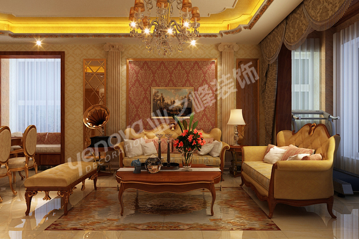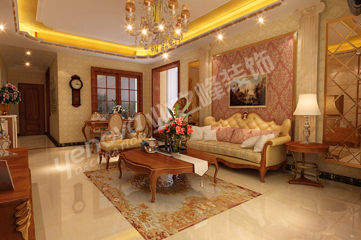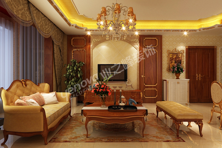 本案设计业主喜欢奢华的感觉,提到奢华,最适合的就是金碧辉煌的欧式。顶面金箔,描金线条的使用,把每个细节做到细致入微。与顶面造型呼应的地面铺装,一整块地毯拼花瓷砖,大气好打理。而墙面必不可少的就是石材,而全部都用石材又会感觉冰冷,红木的木质护墙板与其搭配,效果才会更加出众。