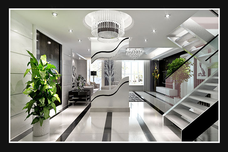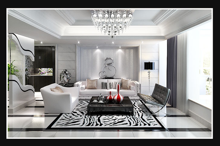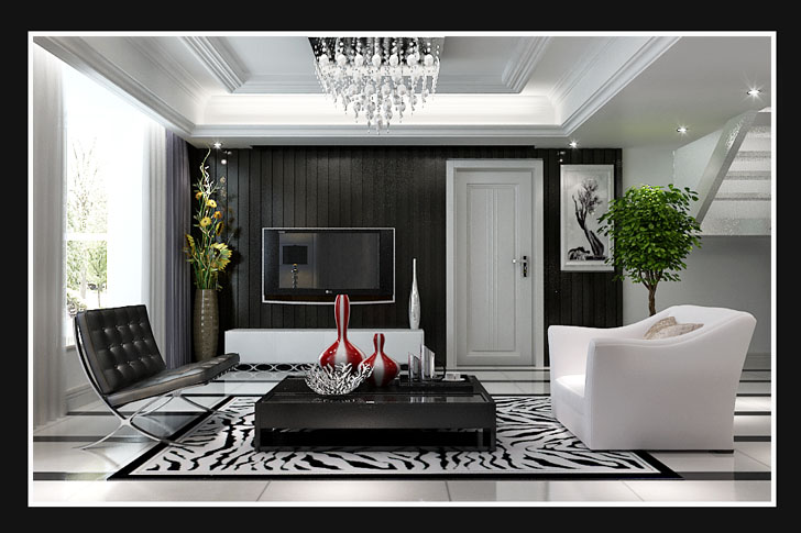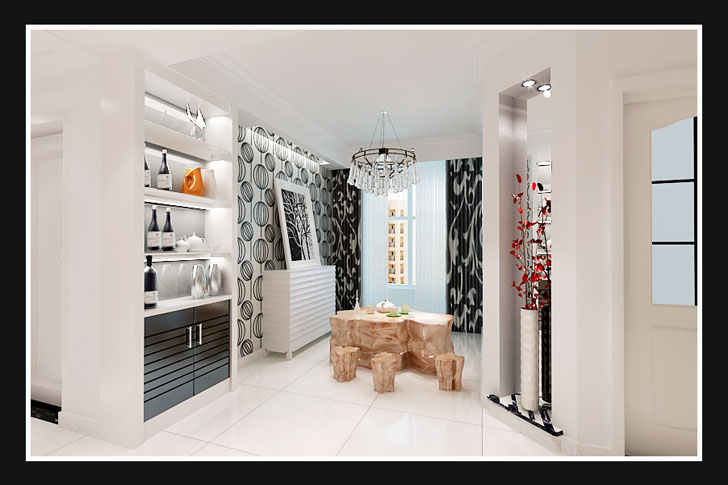 本案设计中采用黑白两色,追求个性的室内空间形式和结构特点。色彩运用大胆豪放,追求强烈的反差效果,或浓重艳丽或黑白对比。强调塑造奇特的灯光效果。打破横平竖直的室内空间造型,餐厅背景墙运用大理石,空间奢华感加强。该案例时尚新潮,非常适合年轻小夫妻的居住。