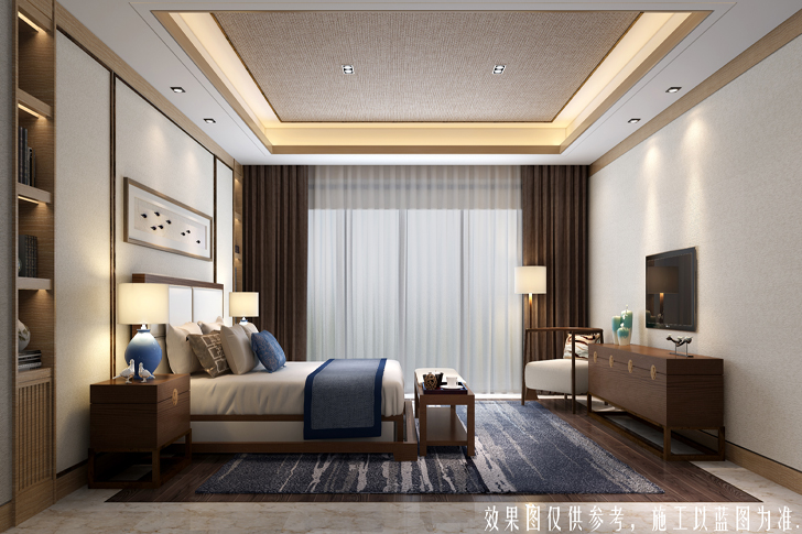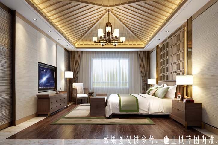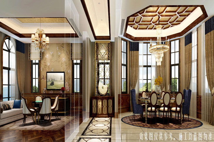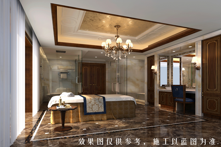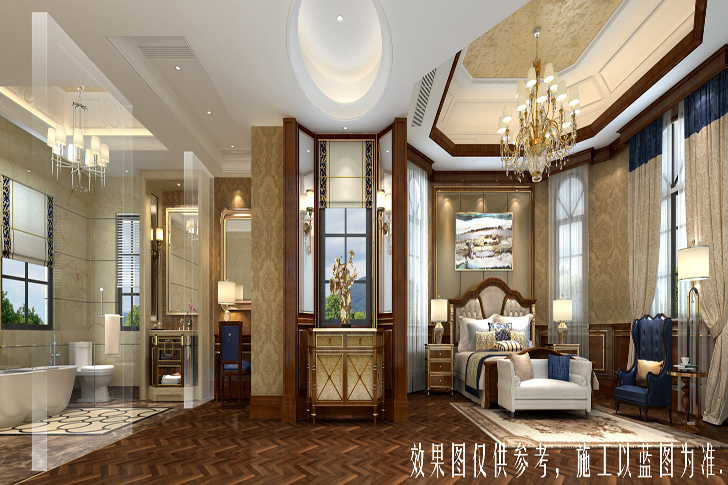 本方案定位于美式风格,空间进行巧妙的设计与分割,按休闲娱乐与待客等不同功能进行空间上的调整,即不相互影响又相互联系。同时整体空间巧妙地运用了大理石、护墙板等饰面,其中的点缀描金对整体空间起到了画龙睛的作用,既丰富了空间又增加了空间的实用性。整个空间的吊顶新颖时尚,运用了充满现代色彩的镜面,客厅背景墙用石材、镜面软包相互融合,使美式的特点在空间尽情展现。主卧奢华舒适的床品与地面地毯照相呼应,总览整个布局,无一不体现艺术与时尚的结合。