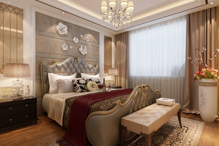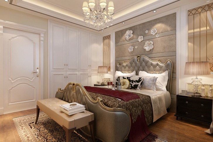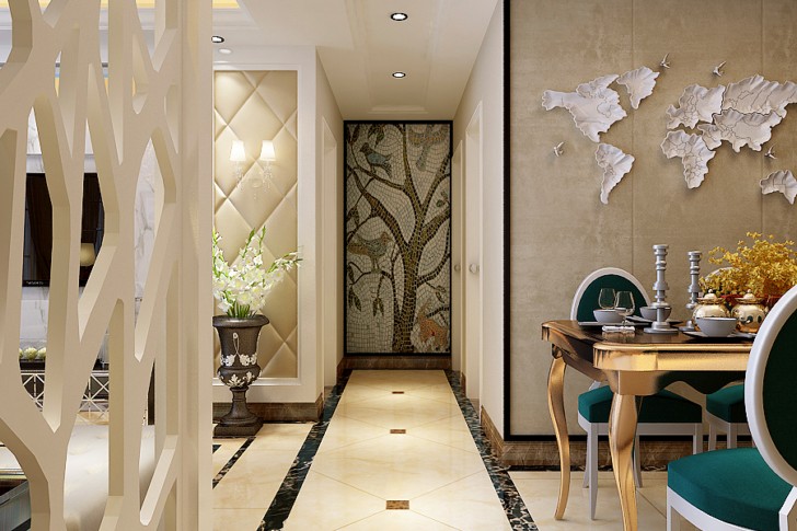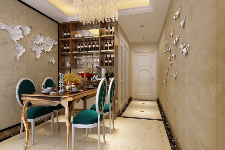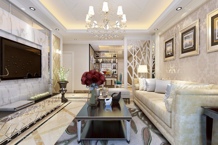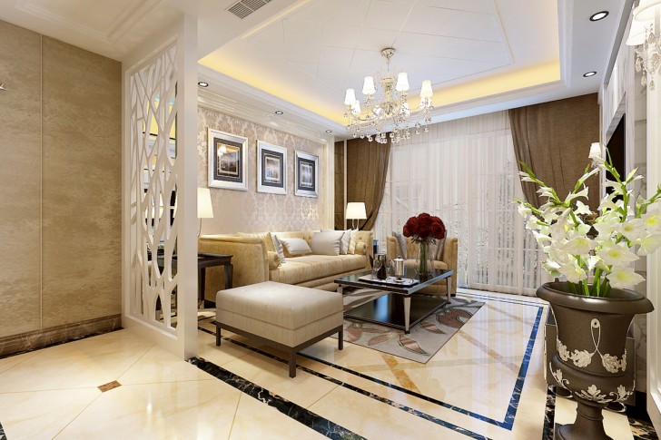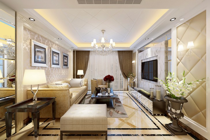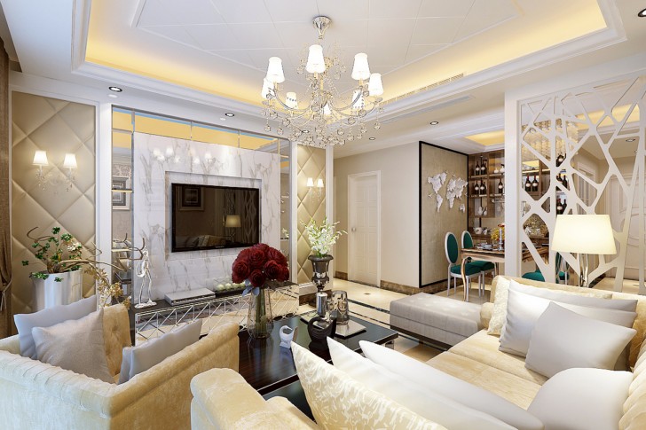首先在功能方面,要充分满足业主的生活要求,客厅是交友娱乐中心,影视墙左右两边采用图案为菱形的软包设计,中间墙采用人造大理石,通透感质地感明显,周边则用镜面围绕,既大方又具有现代感。客厅墙面色贴欧式花样壁纸,属暖色调。尽显欧式设计元素。