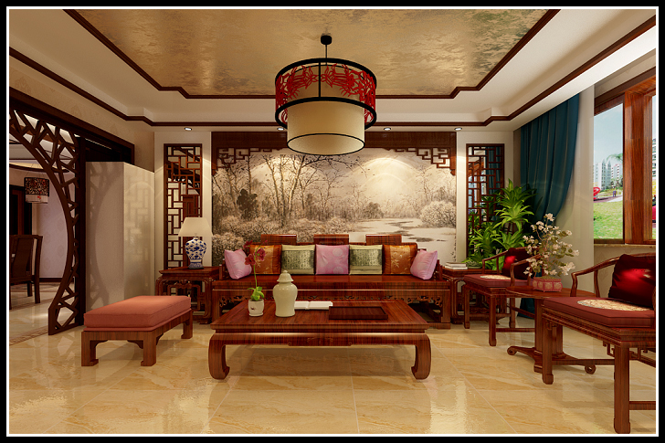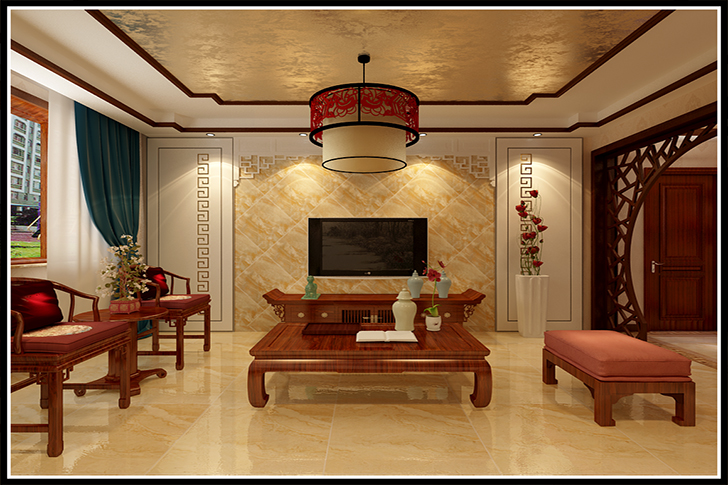 客厅电视墙运用了石材来点缀,使整个空间大气又不失古典韵味。中式实木雕刻成各式题材造型富有立体感。配饰擅用字画、古玩、卷轴、盆景,精致的工艺品加以点缀,把中式与现代完美融合。