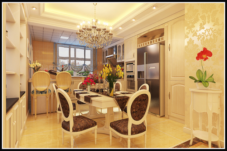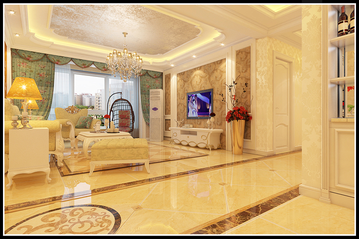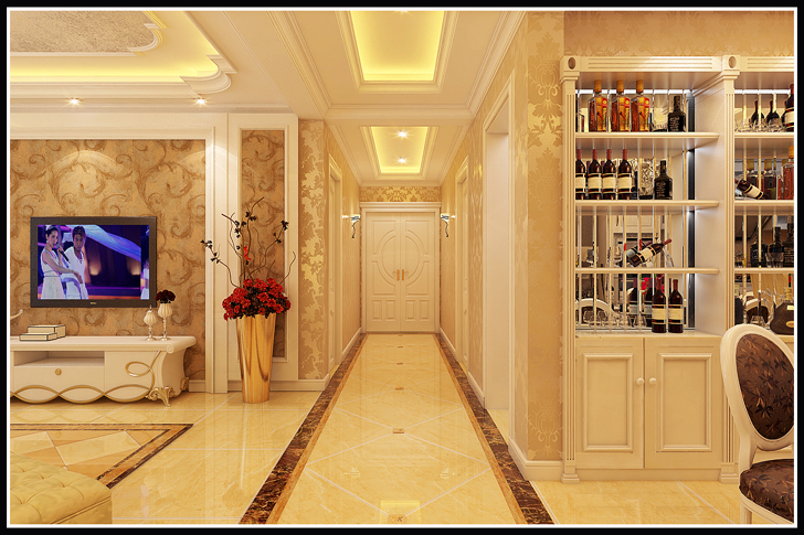 此设计方案定位为简欧风格,居室中以局部造型和大面积壁纸相结合,彰显出高贵典雅的气质,本案的设计重点是会客空间与门厅以及过道空间互通与走廊的拼花地板,简单,大方而不失高贵的气质,电视背景墙用了卷叶草壁纸饰面,使整个空间显得随意舒适。沙发背景墙面的应用,“鸟语花香,枝繁叶茂”的环境映射出四世同堂的幸福!