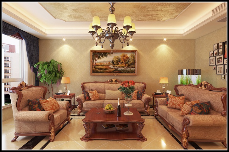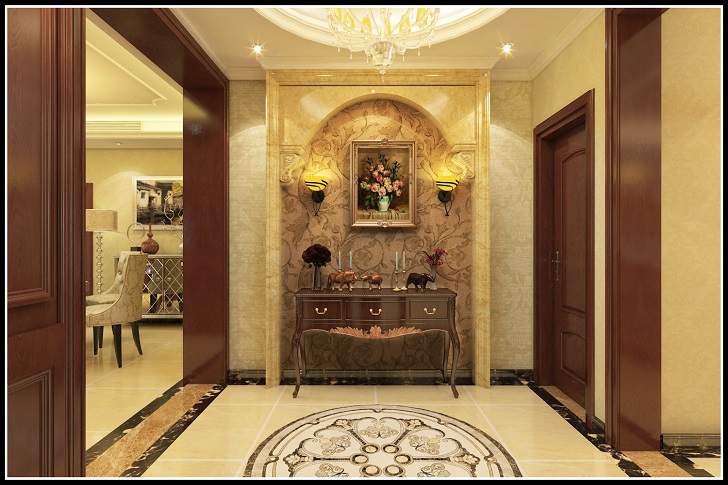 这是一个四室两厅的户型。本来户型就已经不错,但经过我们的反复推敲,通过改变走廊和客卫生间的大小,来实现功能性比较强的衣帽间,并且客卫生间实现了浴缸和淋雨区同时存在的强大功能。在材质运用方面,客厅电视墙以及端景墙运用了石材来表达,使整个空间大气又不失古典韵味,使得天然石材的肌理和欧式皮质沙发的肌理形成很好的对比。
