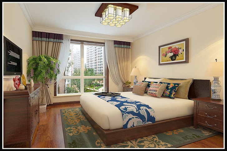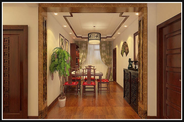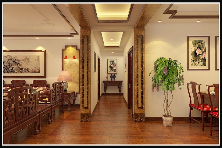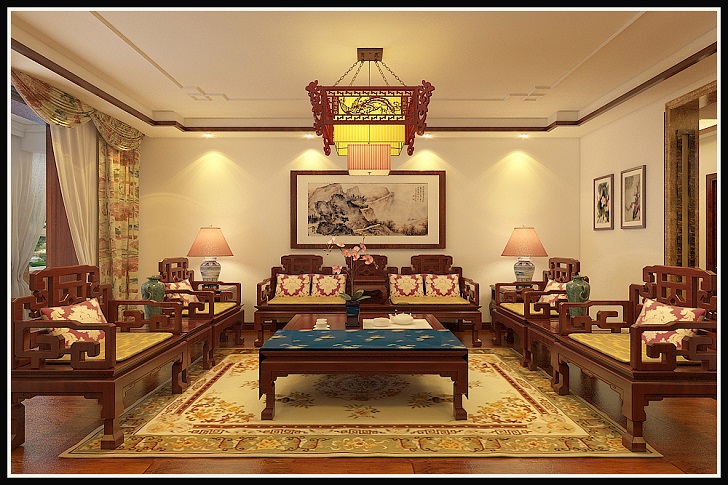 客厅摆放一套明清的红木家具,墙上挂一幅中国山水画等。中式风格的客厅具有内蕴的风格,为了舒服,中式的环境也常常用到沙发,但颜色仍然体现着中式的古朴,中式这样表现使整体空间,传统中透着现代,现代中揉着古典。可以说无论现在的西风如何劲吹,舒缓的意境始终是东方人特有的情怀,因此书法常常成就这种诗意的最好手段。这样躺在舒服的沙发上,任千年的故事顺指间流淌!