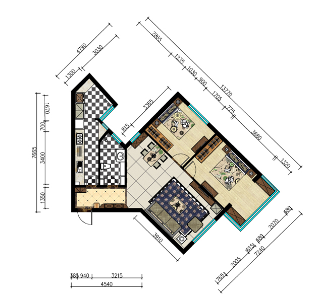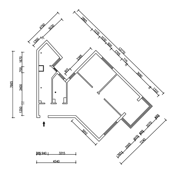 在格局上:本户型的不规则性给本案构成了优势,通过软装布局使空间功能分离而又相互依存,巧妙地使各个空间相连相通。