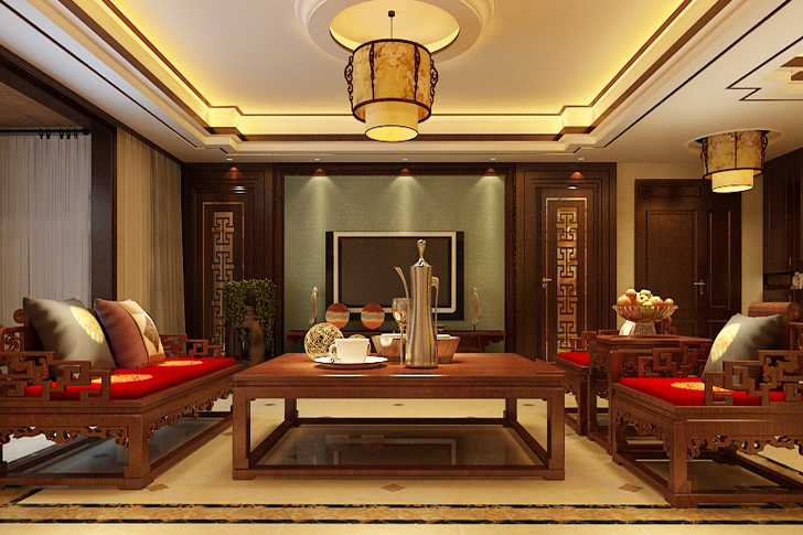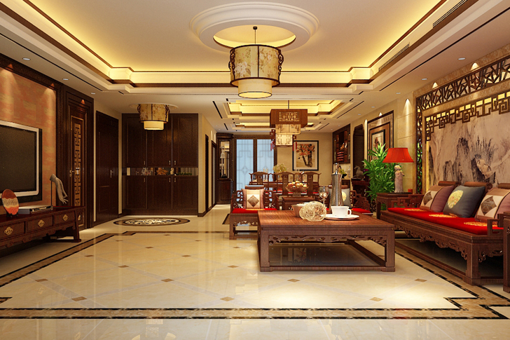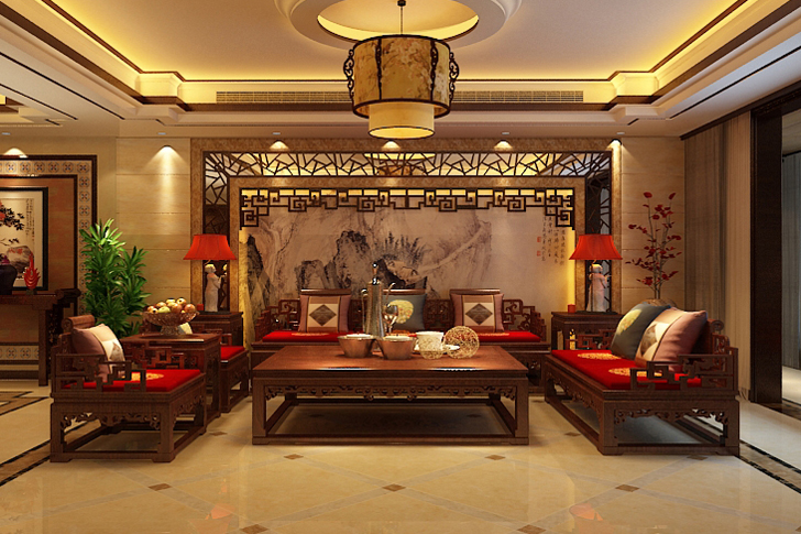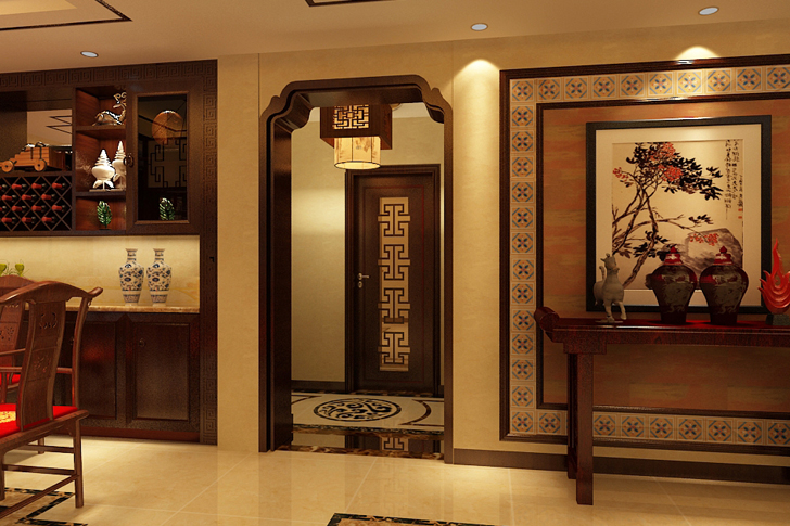 此设计方案中式风格,居室中以局部造型和大面积壁纸相结合,彰显出大气典雅的气质,本案的设计重点是会客空间与门厅以及过道空间设计造型,简单、大方而不失高贵的气质,沙发背景墙用了中式雕花饰面,使整个空间显得更高雅;从设计手法上采用了先整体考虑后局部划分的设计手法。使各个空间得到了巧妙的衔接与统一。