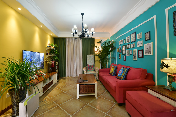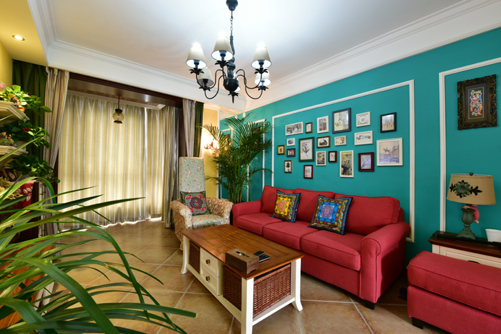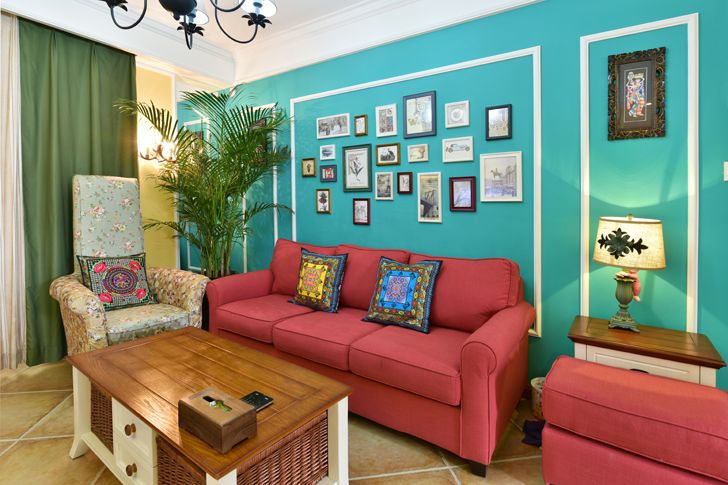 翠绿的沙发背景墙的空间搭配红色沙发。大胆的颜色搭配突显了一种另类时尚。