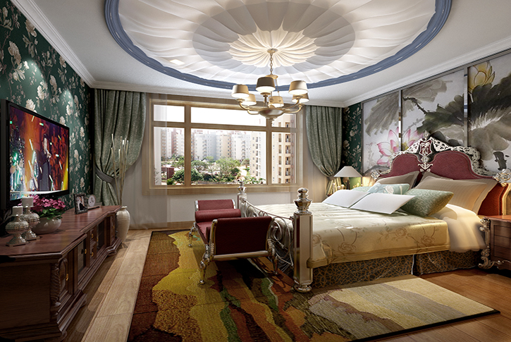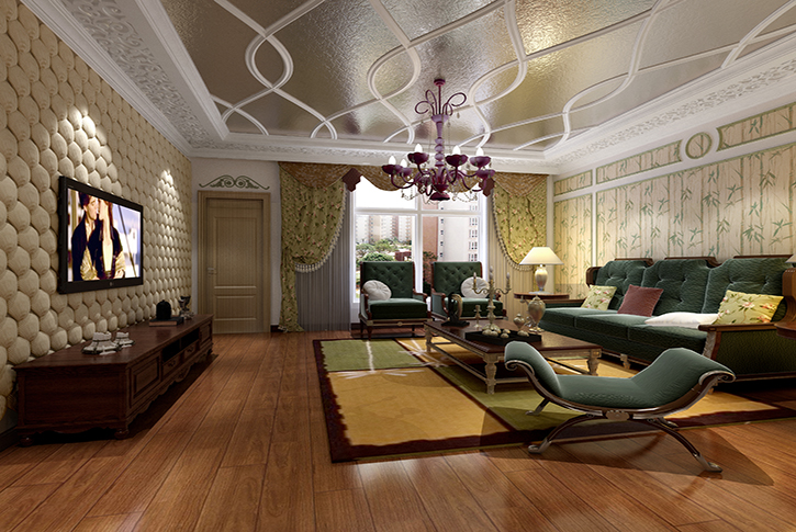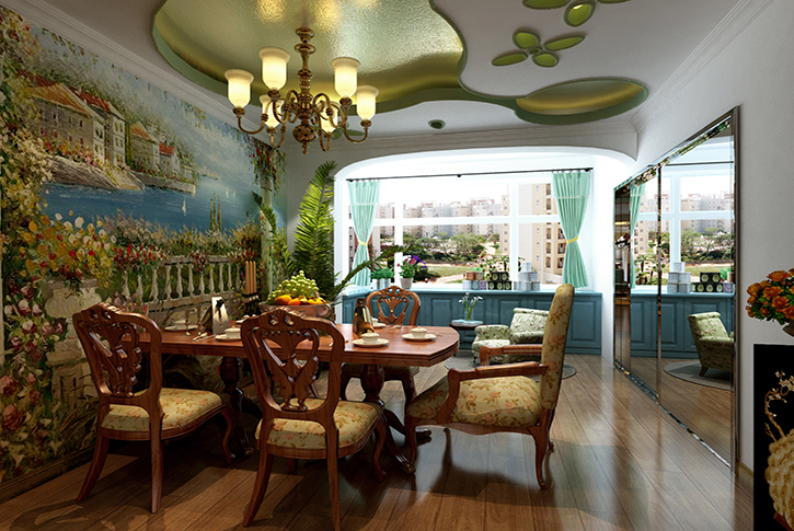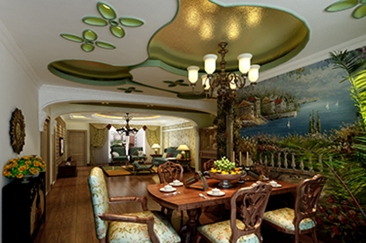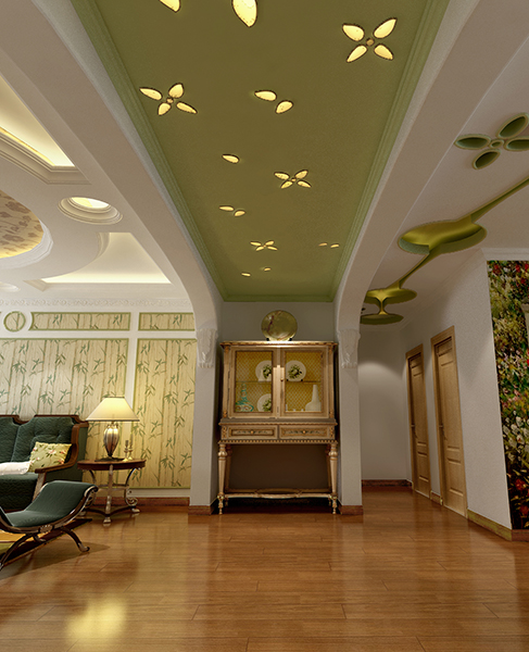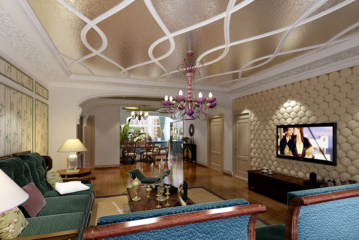 极具个性的屋顶是本方案一个亮点,墙上的中式壁纸使整个空间更加的古朴大气,电视墙的贝壳造型犹如在海边沐浴着海风,客厅房顶成流线型,与海水波浪相得益彰,更加凸显了整体房间的独特氛围。餐厅的清爽感觉不同于客厅的大气,清爽的感觉使得全家在这里用餐时气氛更加的活泼,厨房门的不锈钢反射使得空间更加扩大,看起来不会狭小压抑,走廊的色彩很好的区分了客餐厅的区域,通往卧室的走廊与餐厅的房顶联系在一起,使其成为整体的造型。主卧是家里拉人居住的场所,古朴大气的感觉,在色彩的搭配上又是活泼开朗的体现。在大空间的古朴大气中透着一丝不服老的年轻气氛。