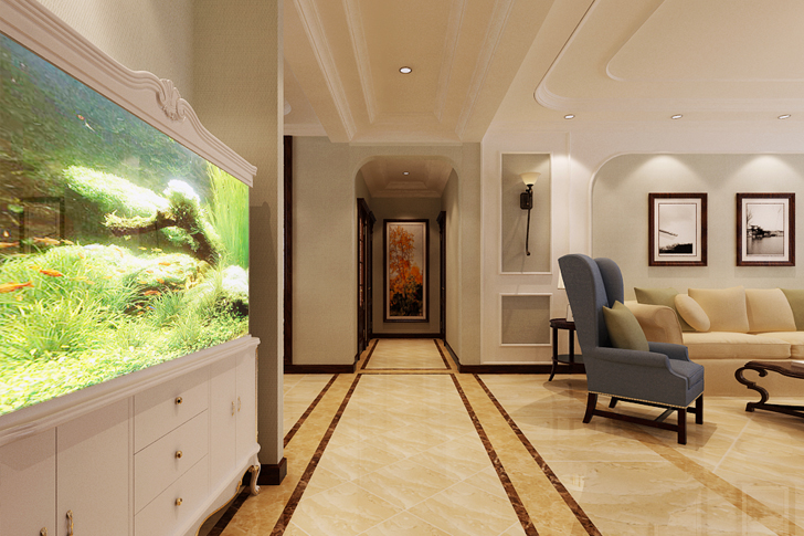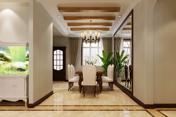 此案为经典三房户型,172平米,客厅和餐厅都有相对独立的区域,而且空间尺寸布局合理,采光良好,南北通透。美式风格质朴大方,洗去铅华回归本真。本设计方案从进门处开始,沙发墙用石膏板造型墙和壁纸搭配,做了对称造型,简单大方。 餐厅用了经典的车边境造型,从视觉上扩大了餐厅的面积。主卧室划分了单独的衣帽间,使整个空间更加规整,划分更加明确。本案从色调和配饰上都做了精心的设计安排,使整个空间质朴温馨