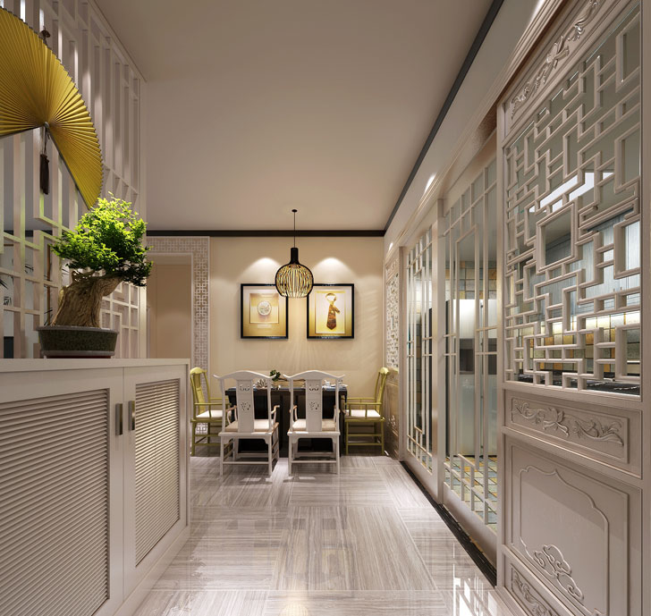 本案是一对夫妇带一小女而入住。 标准南北通透两房。喜欢中式的韵味。但担心中式过于沉闷。 所以在设计本案墙面以中式雕花为主。 但木作油漆做奶白油漆。 地面以更透亮的法国木纹灰大尺寸地砖铺设。 电视墙以简单的木作线条。配以铁艺竹叶。随风而落的摆放。 更显隋唐时期的随性。