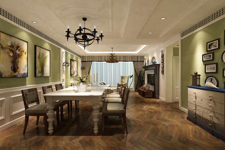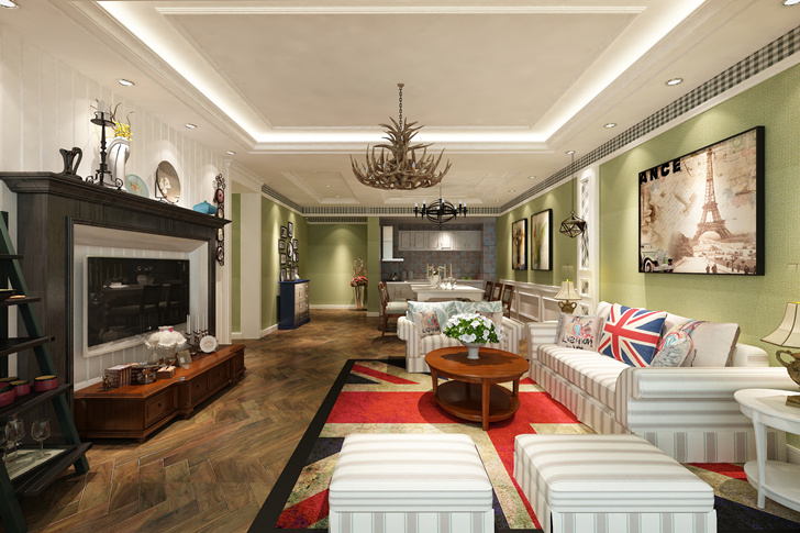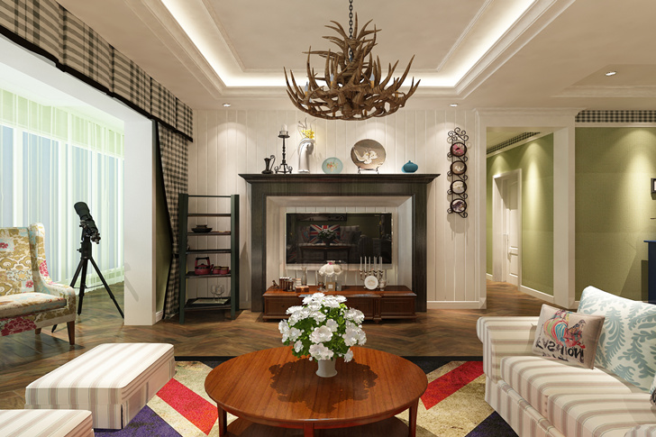 户型原始结构布局较为合理,在功能分区上的改动不是很大,但对空间大小的营造做了比较大的拓展,业主崇尚温馨、舒适的生活,因此在设计上要求除了基本功能的舒适之外,对空间品质与气氛营造也做足了功夫。 根据业主的要求和对空间布局、结构的分析,美式的设计风格贯穿了整个空间,天、地、墙的整体性的应用。吊顶采用大叠级与暖绿色系列的壁纸的主墙纸。为了增加电视背景的视觉宽度,在背景墙的设计上采用壁炉铺贴石材的方式,另外护墙板与石膏线条结合运用,使其与背景墙与吊顶形成统一感。餐厅背景墙采用护墙板、壁纸呼应的设计手法,即和电视背景形成呼应又增加了空间的视觉宽度。 相信在公司和业主的共同努力下必定打造成为一个温馨的家居环境。