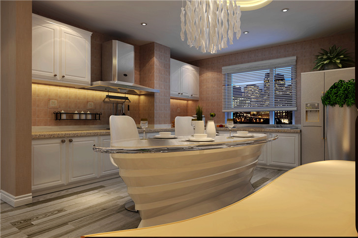 餐厅和厨房融为一体,开放式的厨房让全家人的互动多了起来,造型具有几何设计感的餐桌、吧台与顶面造型紧密相关,别出心裁。曲线形的地台设计,让空间的流畅性更加完整。