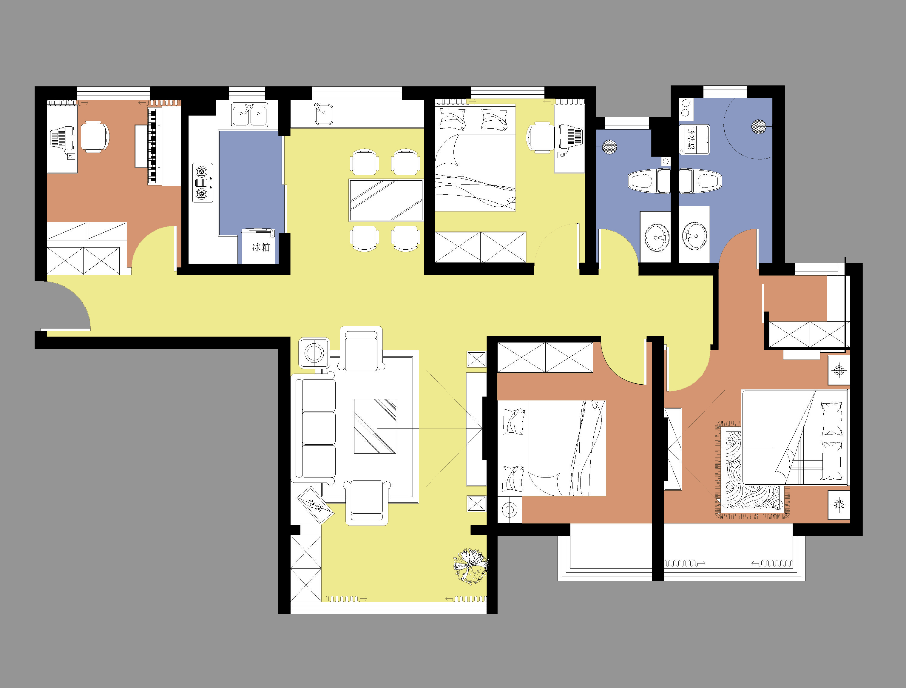 卧室:在合理的空间划分上进行空间布局,在满足实用功能的基础上通过流畅的线条和配饰来满足整个空间的需求。