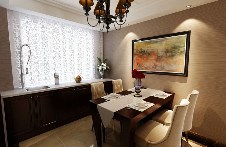 客厅:影视墙通过大理石与木材的有机结合,更具时尚感。餐厅:为弥补厨房空间小,在餐厅阳台设置冷餐台,方便实用还增加了储物空间。