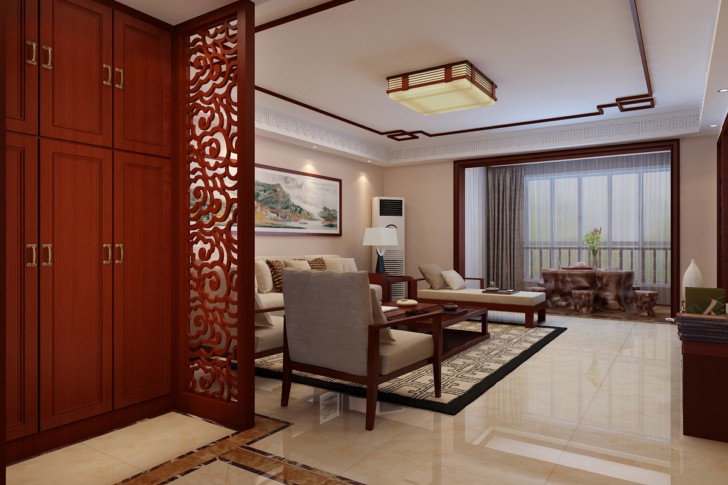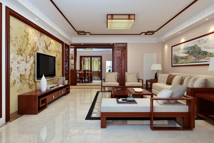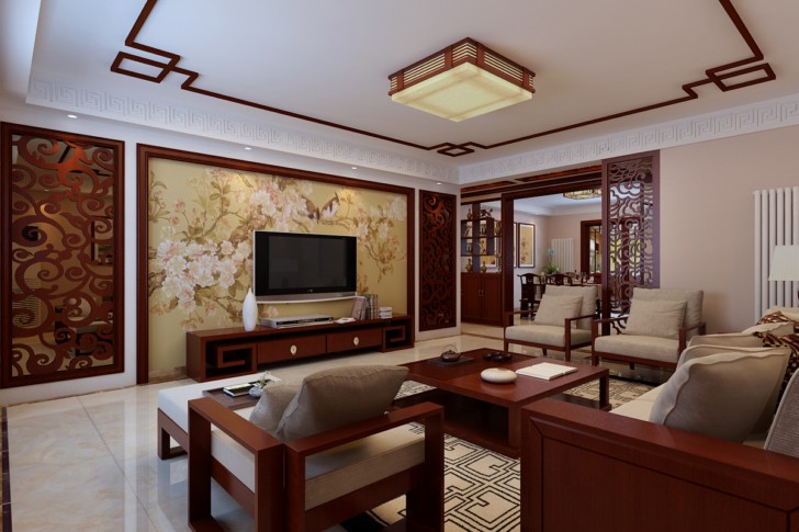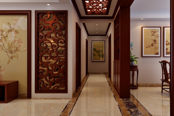 本案例采取简约新中式风格。简约是细节上精致卓越的追求,是舒适愉悦的氛围,从简洁中突出家的和谐。客厅以暖色为主调,浅色沙发布艺配以深色木纹,创造出一种古朴感,躺在这舒服的沙发上,任千年的故事顺指间流淌。餐厅顶部运用质感木梁,中式回文的悬挑台板,使餐厅与客厅和谐统一。雅致的浅褐色壁纸勾勒出整个空间的庄重。顶部的设计突出了空间的功能性,墙面线条的流畅演绎出一股汹涌的潮流,而壁画的选择却为房间的设计增加了几分优雅。中式花格、水墨韵味的墙纸、古典回字文的地毯,墙上的小装饰····所有的元素绘成了一个朴素和雅致结合的中式空间。
