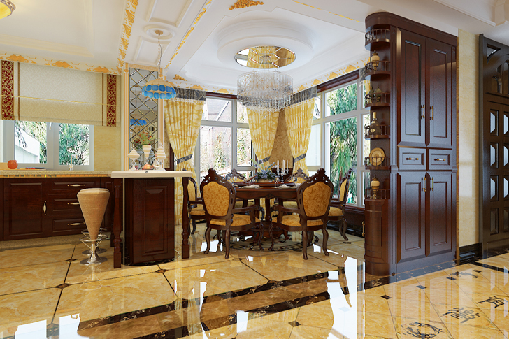 厨房与餐厅空间,为开放式厨房入户口的走廊与厨房更是巧妙的运用了地拼的造型来分割空间,祥云的拼花图案,寓意着业主一生平安祥和,整个空间的设计由顶面到地面无处不体现着设计师细腻的心思。实木的橱柜与家具完美的搭配,使整个空间看起来更沉稳大气,又不失奢华。