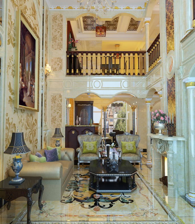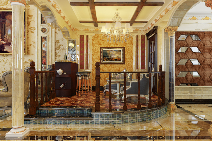 大厅,区域主要利用直线与曲线的相互作用,搭配着经典的猫脚家具与装饰工艺相结合,形成了客厅华美而厚重的气氛。在以典雅、舒适为基础,用大理石、华丽的织物,精美的壁纸、多姿曲线的家具,体现出了豪华、富丽的特点,使空间充满了强烈的动感效果。美感的流露存在与每一个细微之处,地面拼花与顶面聚宝盆造型的吊顶设计照相辉映,在完美的设计中更寓意了吉祥如意、招财进宝的美誉。