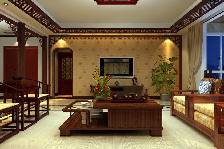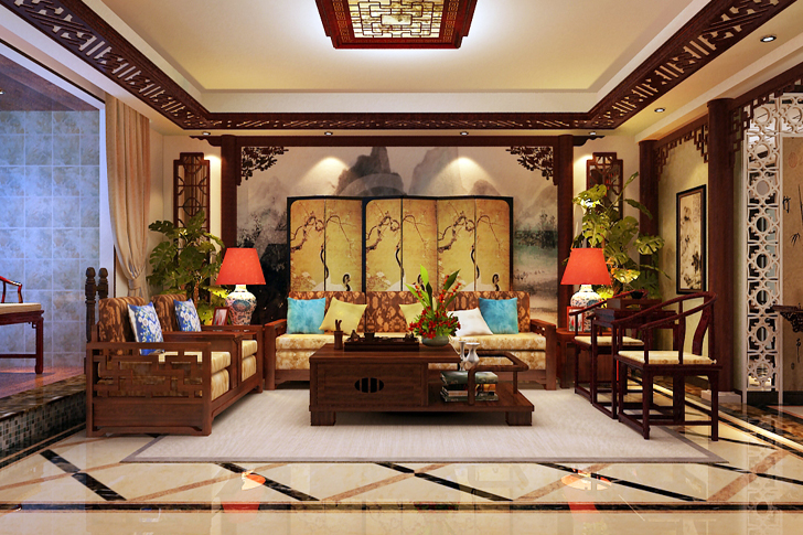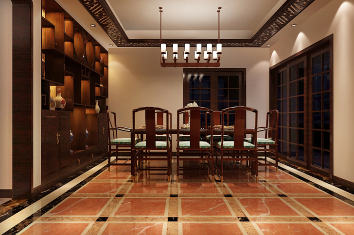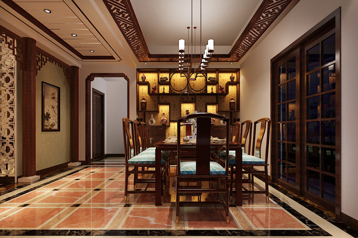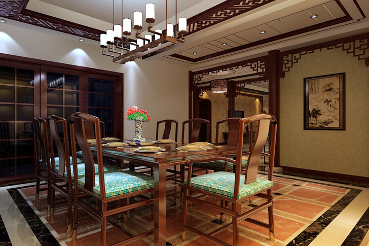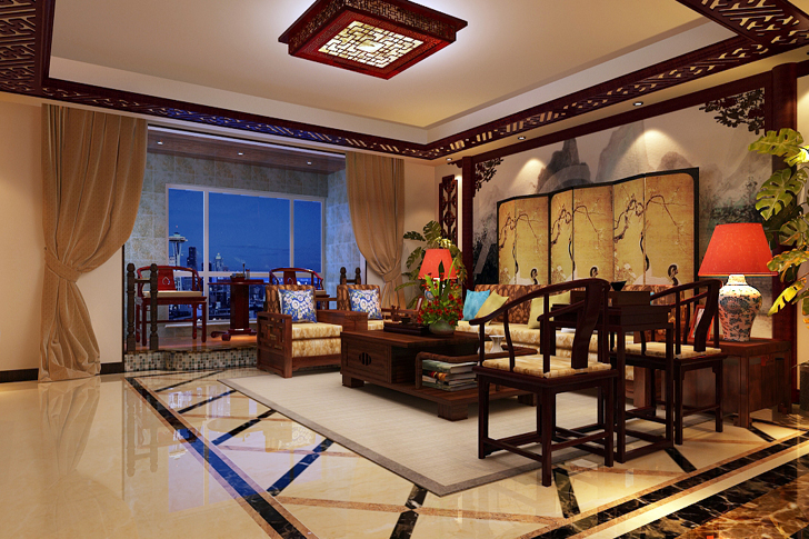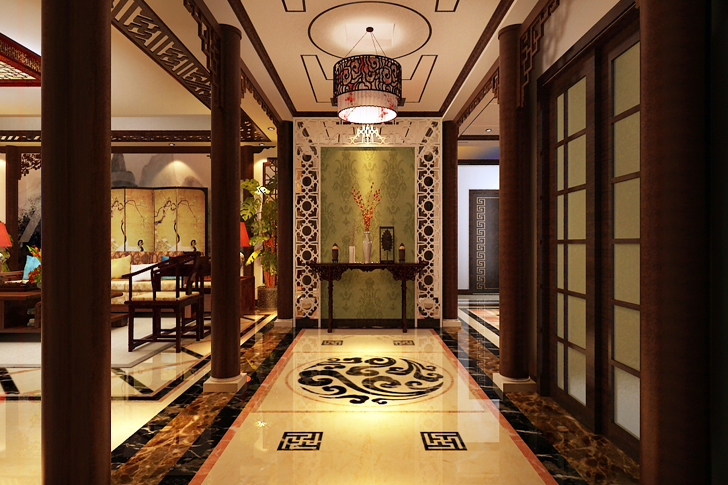 本方案为四室两厅的户型,风格定向为中式风格 。本户型入户玄关处立面两边设计了两排实木柱彰显尊贵,大气入户立面白色一致的花格点缀着。地面的祥云图案拼花更有平步青云的意境,卍字格的拼花地砖错落有致置,顶面相互对衬的花格。整体玄关入户给人以庄严而又蕴含浓重的文化底蕴。客厅地面拼花,沙发背景墙依山傍水的壁画,彰显了主人儒雅的意境,顶面花格的装饰更为装修的风格增添了一笔浓郁的色彩。餐厅网格的拼花是餐厅看起来不空旷乏味。本案整体的装修风格彰显了主人的大气与文化底蕴。