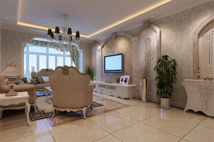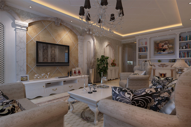 白色混油现代欧式餐桌,黑色吊灯显得餐厅得体大方 窗户石材收边 白色混油柜体和衣柜柜体是餐桌的陪衬,整个空间干净整洁 客厅暖色全抛釉瓷砖 电视背景墙石材线条轮廓拱形造型 黄西米色石材全抛釉背景墙主题墙砖