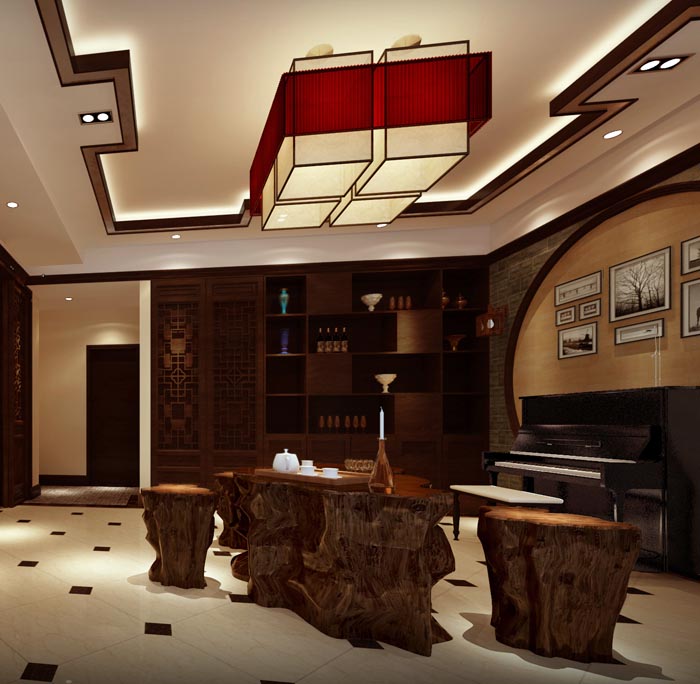 设计说明:中式给人们的感觉就是繁琐,太多的雕花,深沉。但是中式却代表着我们民族的传统文化和历史底蕴。如何让中式更适合现代人的居住,那么本案就选用了具有中式意味的新中式风格。去掉过多繁琐的雕花,保留一定的中式元素,搭配一些具有中式意味的家具和摆件进去。造型上尽量参照中式的规矩方圆,但是却以现代的方式处理、融合进去,使得整体空间有了中式的味道,但却没有了中式的繁琐,更适合现代人的居住实际。业主喜欢红酒,于是在地下室设置了一个酒窖兼娱乐的区域。由于这个地下室并没在花园泥土层以下,所以不象某些别墅的地下室那么潮湿,这样设计师就能大胆的使用更为中式的木作在地下室里,和一二楼的风格呼应却别具一格。