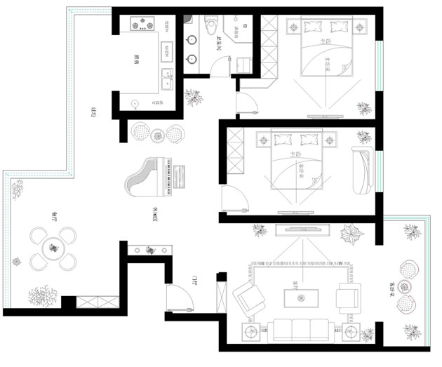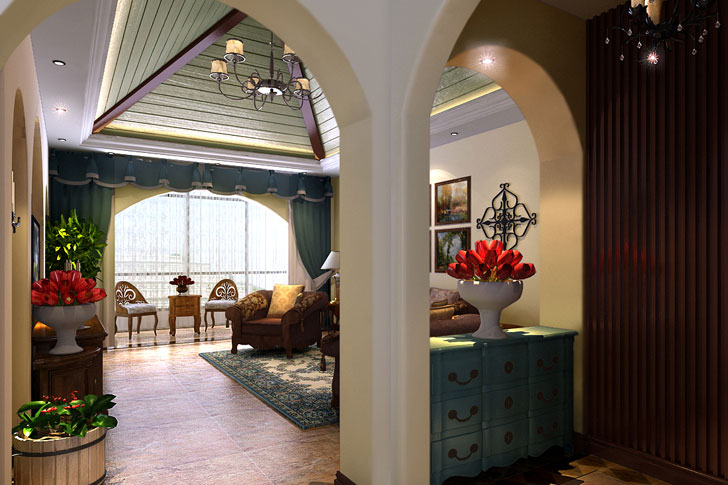 实用,美观是设计永远贯穿的主题,设计师根据原房结构,将其空间巧妙划分,除正常功能使用以外,又划分出一个娱乐休闲的空间,餐厅位置宽敞明亮,阳光,蓝天,白云,给人无尽的遐想。设计师色彩的应用,更是令人惊叹他的构严谨巧妙,蓝色的电视背景,窗帘,家具完美呼应,给我们炎热的夏日带来一丝清凉,从容优雅。植物的放入似乎也别有用心,是的整个空间充满活力,增加了生机。阳光射进,温馨,浪漫。吊顶的张扬 个性,