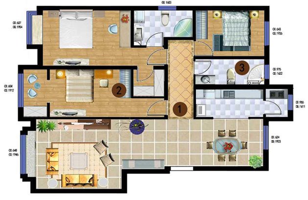 此户型的缺点是进门处正对着的过道过于狭长,次卧室的收纳空间小,卫生间面积小;解决缺陷的方案:利用造型棚和地面拼花来弱化过道狭长的缺点,次卧室阳台做地台既可以增加收纳空间也可以有独立的休闲空间,卫生间的面积过小,将洗衣机放在厨房。