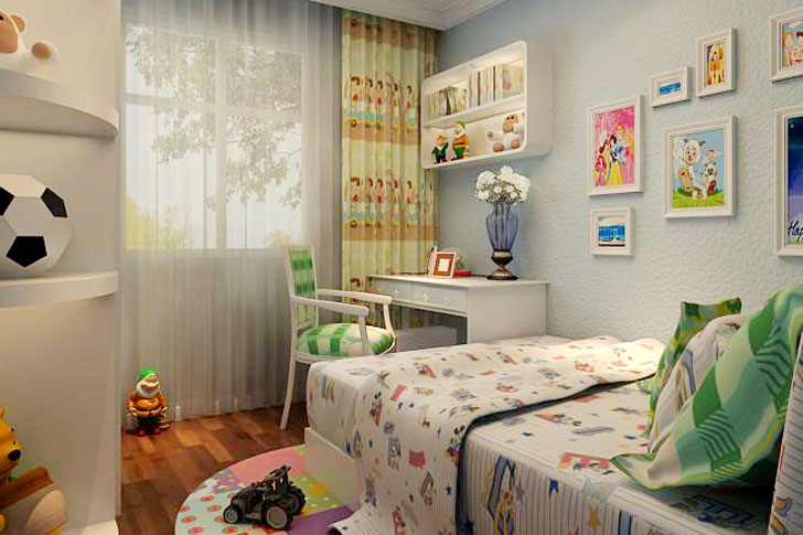 卧室是让人舒服,更加惬意的空间,在生活阳台功能保留情况下,增加一组飘窗矮柜,成为一个休闲区。同时增加储物功能。儿童房,墙面采用可净化空气的硅藻泥材质,采用淡蓝色是空间变得梦的感觉。顶面的石膏板星星灯,起到点缀的效果。