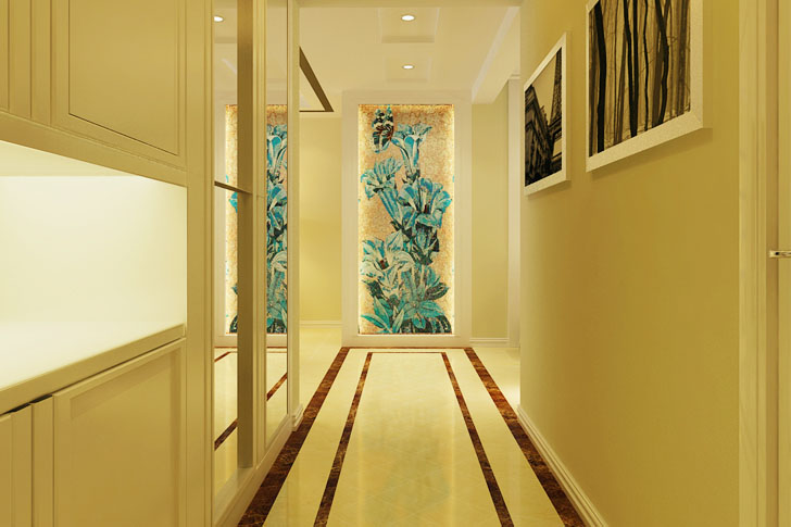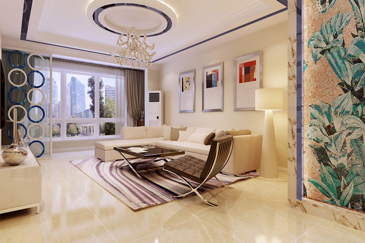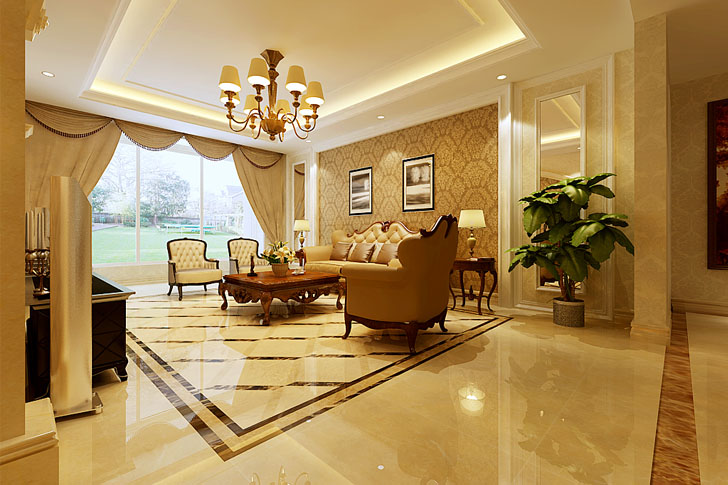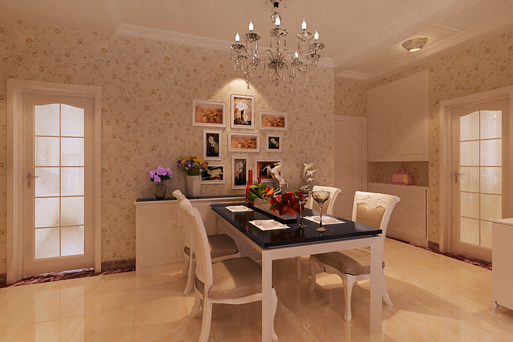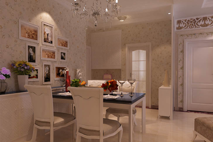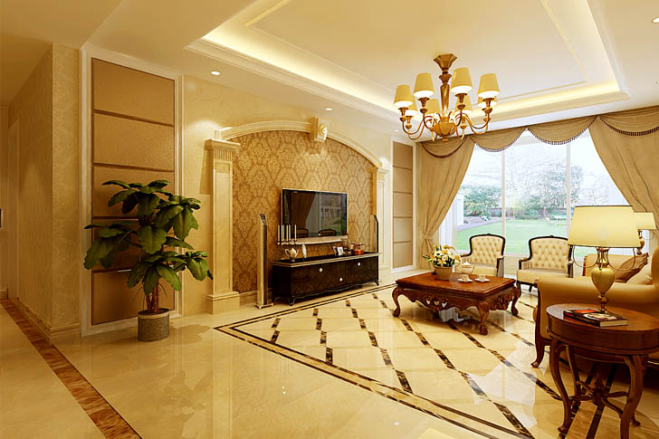 此套方案为欧式新古典风格,客厅经过精心的布置,别出心裁,大理石肌理拱形电视背景墙,很好的诠释了设计的主题。精美的地面拼花,与之相呼应的吊灯,再加上造型简洁大方的沙发,视觉上呈现一种典雅和大气并存的轻松空间。素色的墙纸,淡雅的窗帘,再加之与风格相匹配的软装配饰,整体风格更加协调完善。