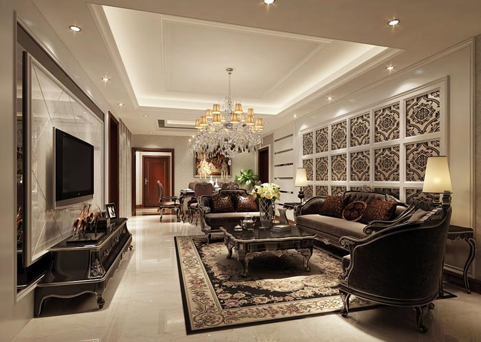 本案是一对时尚的夫妇,喜欢享受生活,享受美好的事物。对于生活的态度是积极向上追求奢华和权势的感觉。女业主喜欢水晶和奢华主义。所以我们定位业之峰设计效果图新古典主义。在客厅我们用了镜面和护墙板结合来做造型,电视墙用石材和镜面来结合。再加上新古典奢华的家具,和水晶灯的配饰。营造出新古典奢华主义。