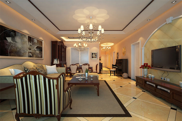 本案就是以简约美式风格为主,不仅采用地面拼花的方法,而且尊重自然光的合理利用。在午后与阳光于此邂逅。褪去富丽堂皇的衣裳。空间透出清澈的背影,深色的地板与浮躁的心情一起沉淀在如薄纱般的阳光里,唯美的线条延伸出应有的典雅,对称的摆设流露出古典风的空间美学。在设计上追求空间变化的连续性和形体变化的层次感,墙面多为温馨的暖色,饰品及家居上采用自然色调来突显自然、休闲,又不失典雅之感。既保留了古典欧式的典雅与豪华,又更适应现代生活的休闲与舒适。
