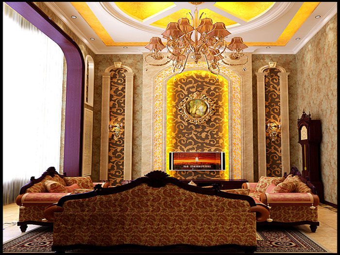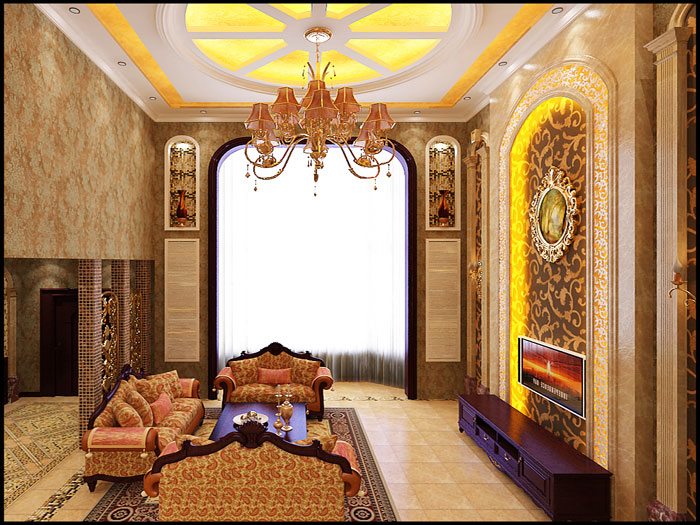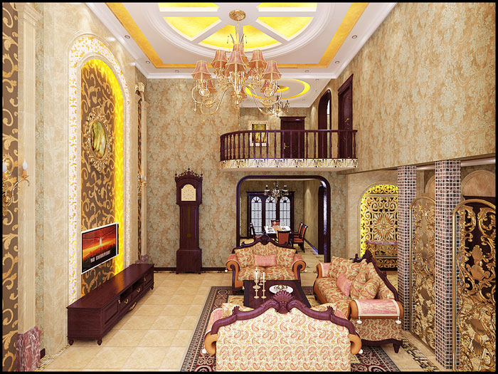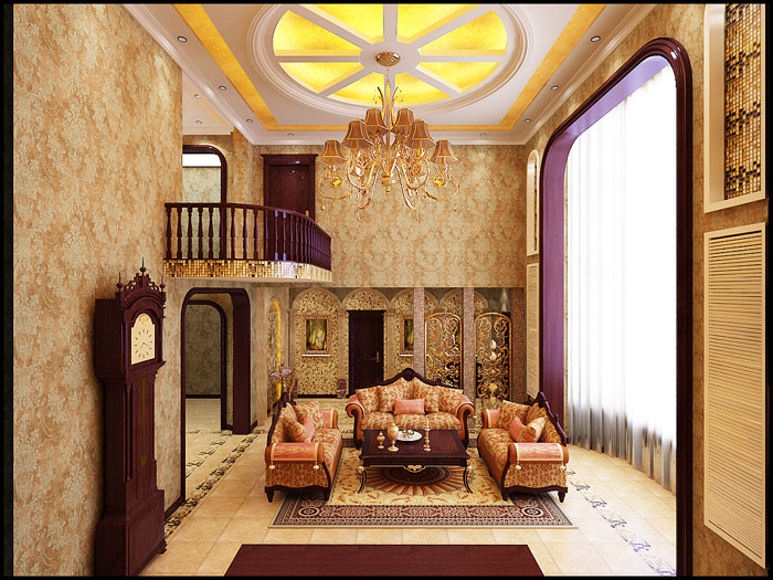 本案的设计重点在客厅的挑空部分,设计成败也在于此,所以在客厅的材质选择和造型的运用上在于了功夫,啡网纹石材、马塞克、红樱桃木结合的运用,将客厅空间完美展示。