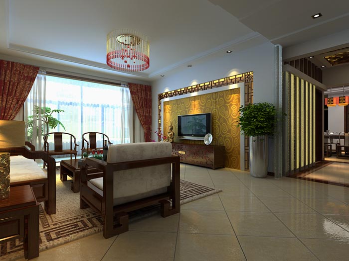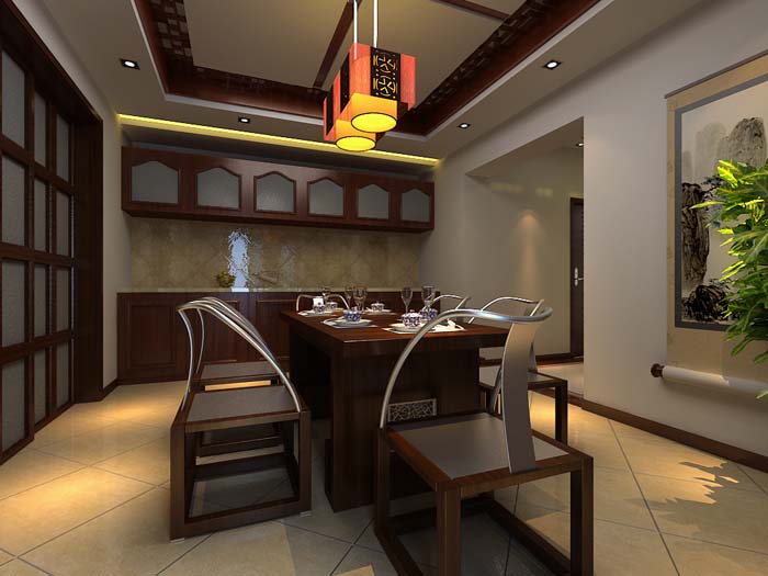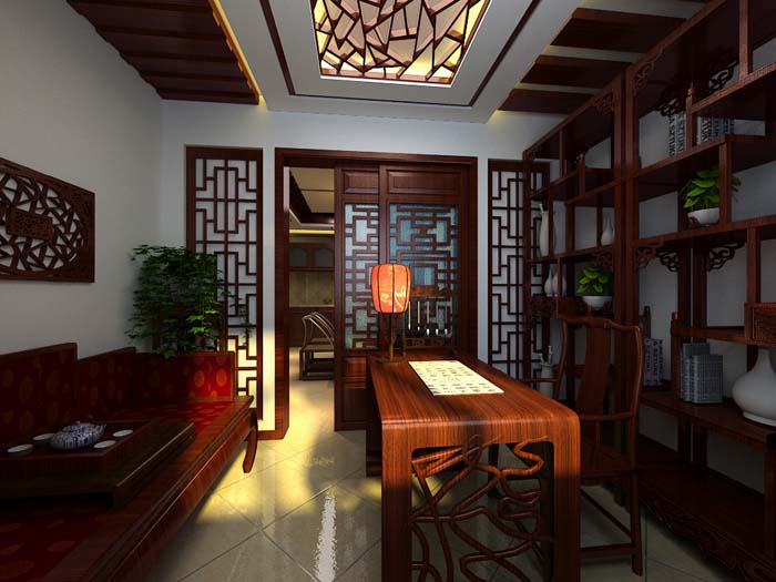 中式传统元素融入现代住址的每一个细节—细致的中式传统窗格、门扇装饰墙面、顶棚,屏风充当隔断;经典的青瓷灯具的装饰,中式吉祥和喜庆的物品及民间手工艺品等都别具风韵