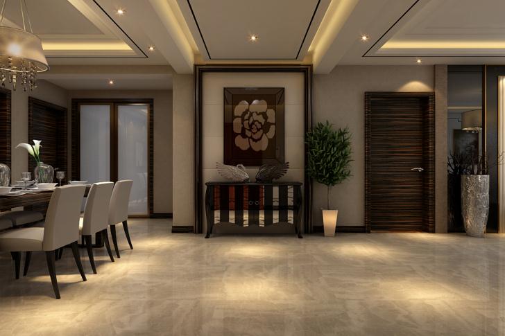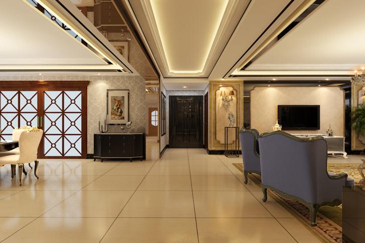 在新古典风格餐厅里,以家具的蓝金色系为主题,与走廊银白色壁纸形成鲜艳的对比,而这样的色彩冲突,正是国内新古典居家风格中少见的大胆之作!
