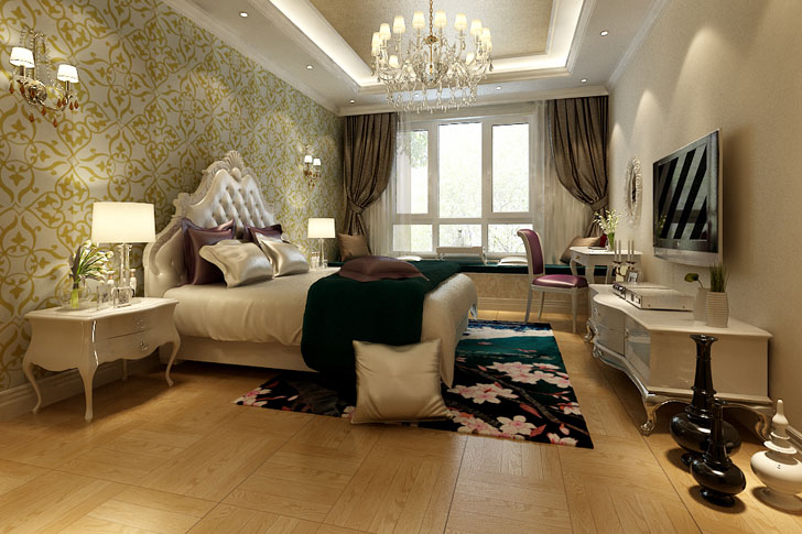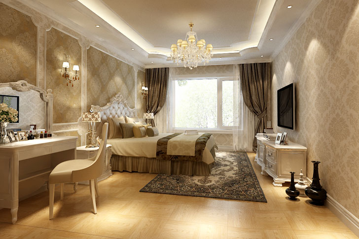 主卧则采用了壁纸和刷漆,用欧式色彩比较浓郁的壁纸,体现出醇厚的视觉感官效应,表现出一种充满奢华的向往;把一些精细的后期配饰融入设计风格之中,充分体现设计师和业主所追求的一种奢华、舒适的生活氛围,也达到了业主的生活品味与需求。
