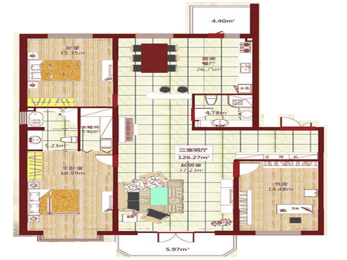 小区:美域江岛 面积:126㎡ 户型:二居 风格:新古典风格