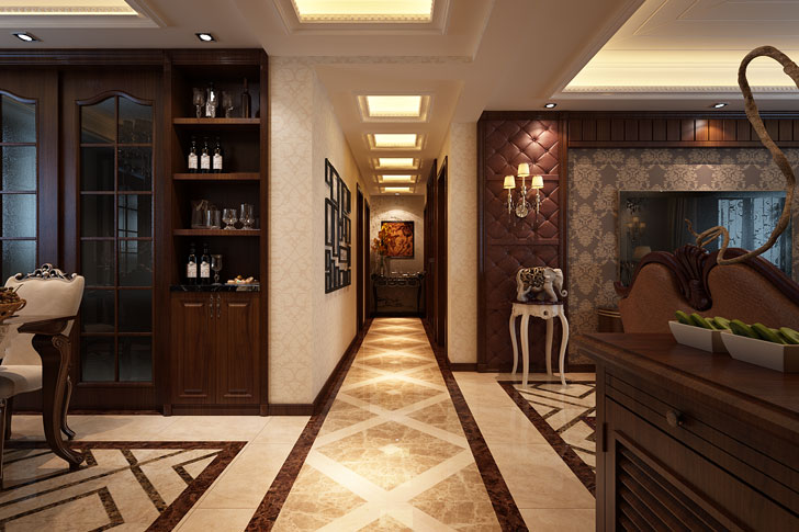 此设计方案为三口之家量身打造;风格倾向美式,居室中所出现的材料皆为紧跟时代潮流的硬、软装产品。
