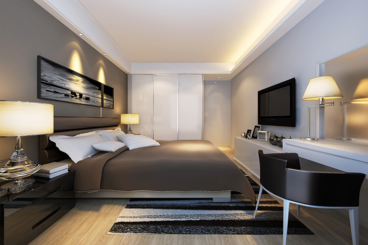 有一种空间的表现叫做宁静的雅致,简单的材质搭配也可以打造知性的魅力。通透的烤漆玻璃仿佛把视线带到了墙的另一面,让视觉精细的同时也带来一种现代的纯净感。轻纱荡,暗香浮,一抹柔光,雅室幽。卧室是休息的空间,不需要太耀眼的光。只选用了一些简单的筒灯做为整个房间的照明,配上同样简单的圆形地灯,既满足了室内的照明亮度,又在整个风格上统一又富有变化。