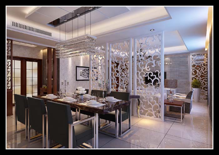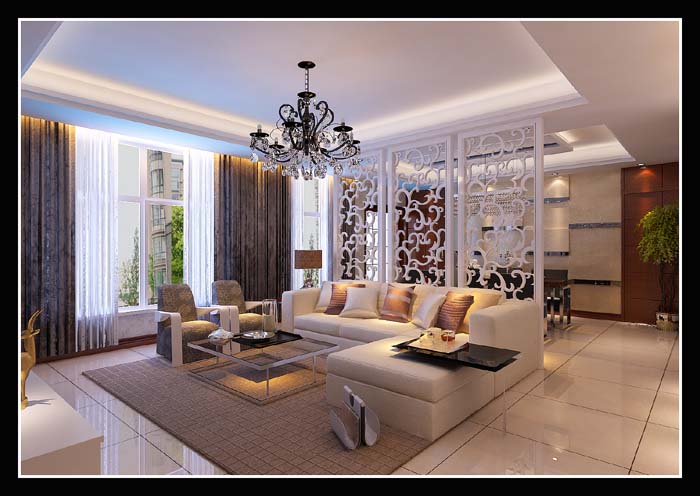通风光线较好整体空间中门厅,客厅,餐厅同在一直线上,客厅朝向为正南方,为了保证空间的开阔性和通透性,没有必要再刻意的划分功能区域,客厅和餐厅区域用装饰架巧妙的划分了功能空间背景墙没有在造型上求太多的变化,表达出空间的纵深感及延续感
