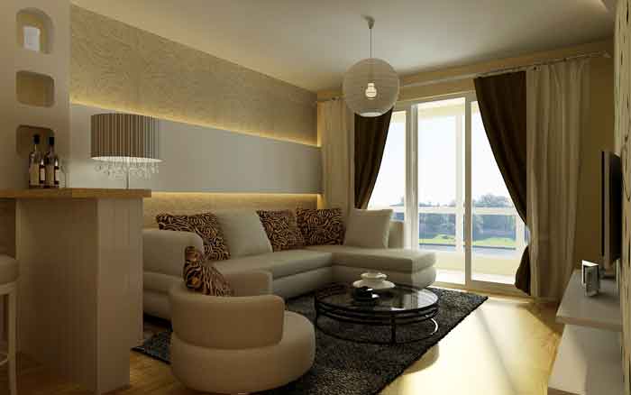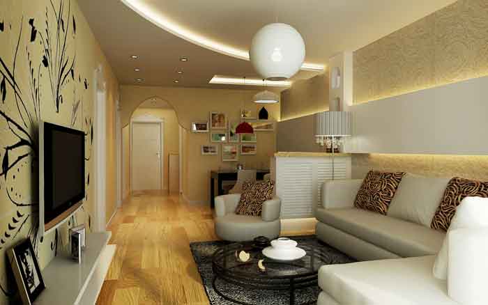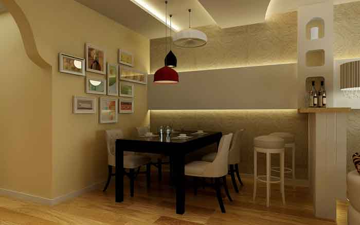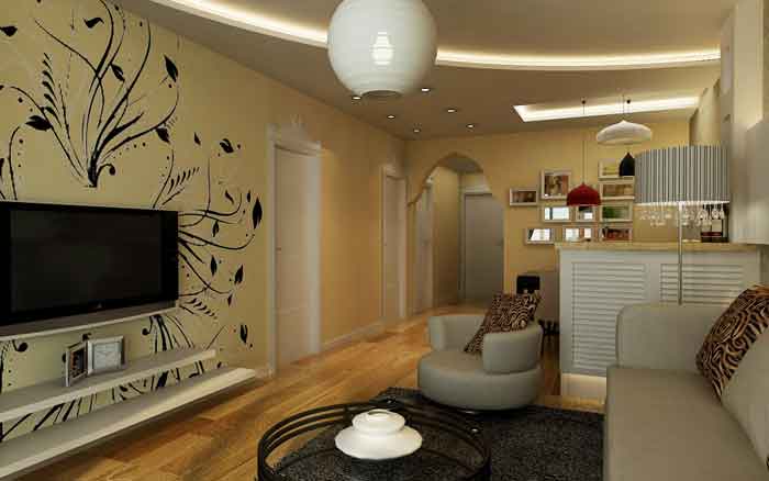 追求个性的80后年轻夫妻 希望自己的家个性又不失温馨,在对客户进行多次接触之后,决定放弃常规的直线造型而采用一些弧形来突出屋主的个性,对整体色调定为暖黄色,增加温馨感,忽略不太完整的电视墙,而选择进门就能看见的沙发背景处做文章。用酒柜兼吧台来分割出本来不明显的餐厅和客厅,也同时兼顾了男主人的爱好,整体效果清新自然,在某些细节处凸显客户的生活态度。