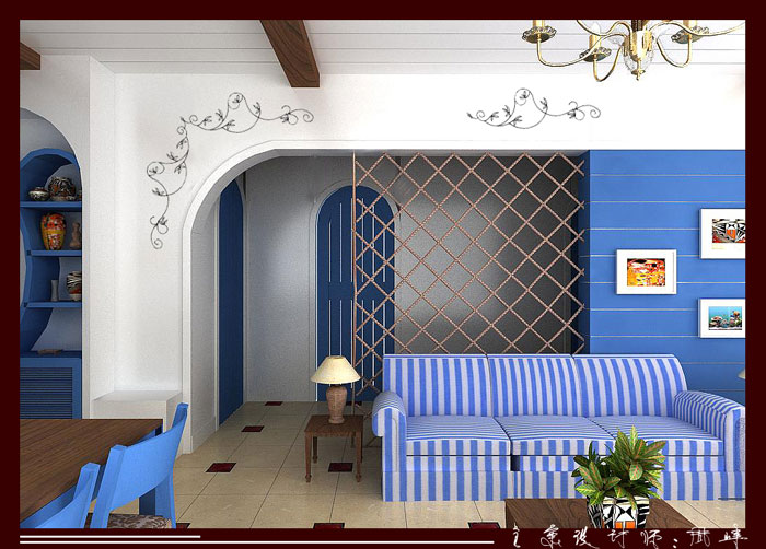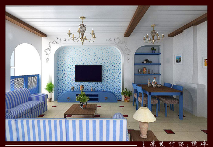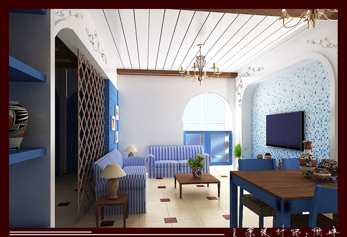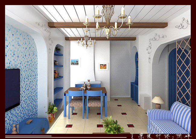 蓝色的大海与白色的云彩加上黄色的沙滩.这是地中海特有的地域特针,设计师通过简单的造型、木制、粗麻绳、简单墙绘等....把地中海风格发挥的淋漓尽致.....