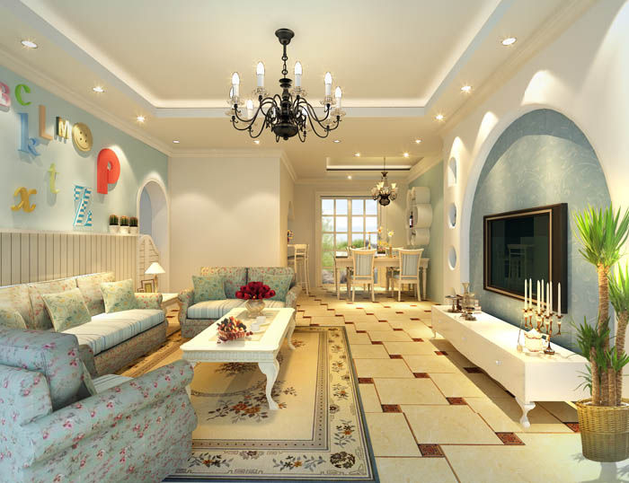 此设计在单层平面96平方米上营造了一个舒适的居家环境,圆弧形电视墙使客厅和餐厅显得温馨浪漫 沙发背景墙的矮桩木条装饰加上淡蓝色乳胶漆 清新爽朗,餐厅造型 酒柜时尚个性配上简欧餐桌时尚中不失典雅开放式厨房加大了餐厅空间使得生活更加的舒适 。此房在色彩搭配上做到了清新爽朗的感觉家具搭配温馨浪漫为客户营造了一个理想的居家环境。