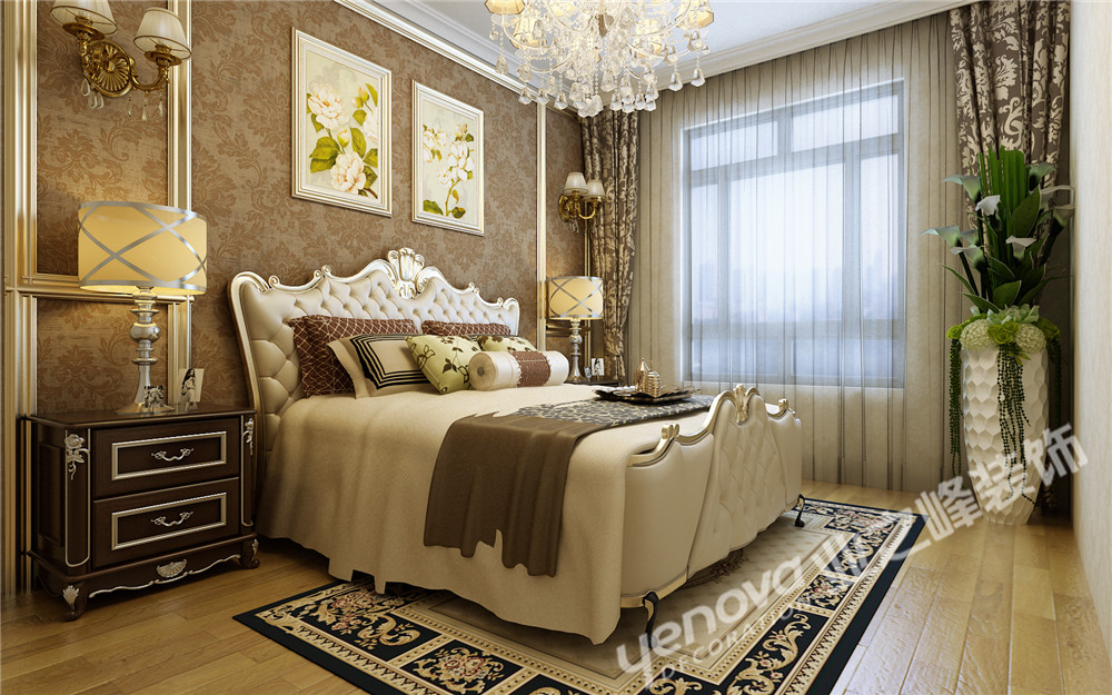 主卧沿袭客餐厅的色系,以暖色为主,简单大方。地面铺设实木复合地板,舒适,温馨。墙面采用壁纸造型,深浅搭配,个性明显。一盆绿植,为卧室增添生机,春意盎然。