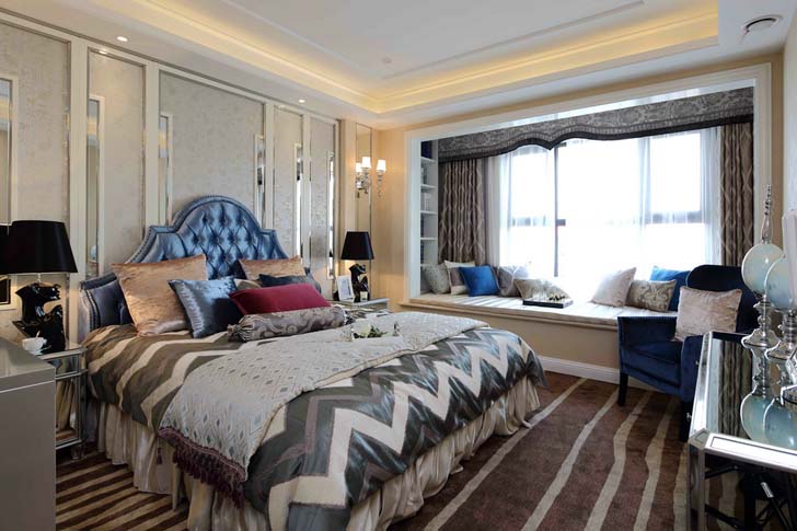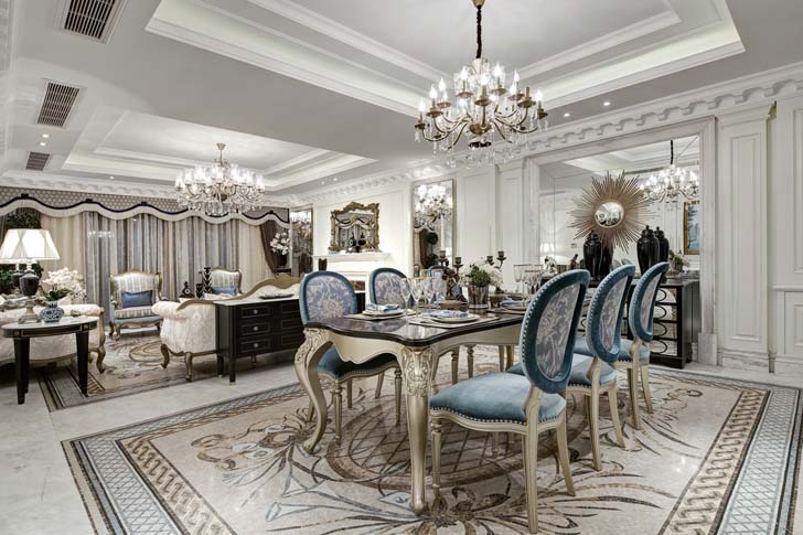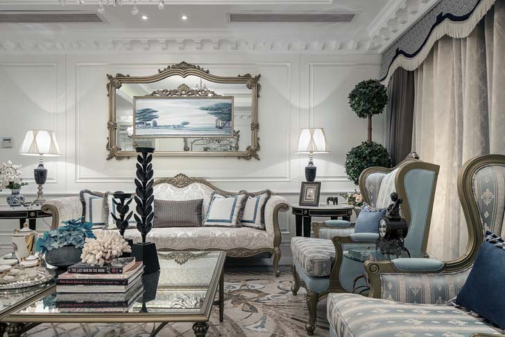 本案例,房子位于西安市曲江新区。案例风格定位高贵典雅的法式现代风格,轻度的奢华和精致的家居是本案的主题。 法式家居常用洗白和华丽配色,洗白手法传达法式特有的内敛特质与风情,配色以白、金、深色的木色为主。现代的的法式风格不仅仅有法式的典雅和高贵也有现代风格的展现,将两种风格和二为一,细节处理上运用了法式廊柱、雕花、线条,制作工艺精细考究。室内空间法式十分推崇优雅、高贵和浪漫,它是一种基于对理想情景的考虑,追求建筑的诗意、诗境,力求在气质上给人深度的感染。风格则偏重庄重大方,整个空间多采用对称造型,恢弘的气势,豪华舒适的居住空间多用石材装饰。 风格搭配原则,餐桌和餐椅均为海蓝色和金色的搭配,更显高贵的生活情调,表面略带雕花,配合扶手和椅腿的弧形曲度,显得优雅矜贵,整体空间恢弘大气,又不失浪漫气息。