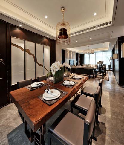 本案室内设计结合现代中式设计手法元素,营造尊贵、私密的氛围,配合少许新古典元素的配饰,更让整个空间极具时尚韵味。本案大胆的改造空间的结构,使整个空间最大化利用,餐厅空间的特殊设计,既是玄关,又是餐厅背景的点缀,使得走廊空间迂回宁静。单独隔出来的阳台空间,主卫集沐浴、泡澡为一体的设计,使空间最大化利用,同时也提高了生活品质。