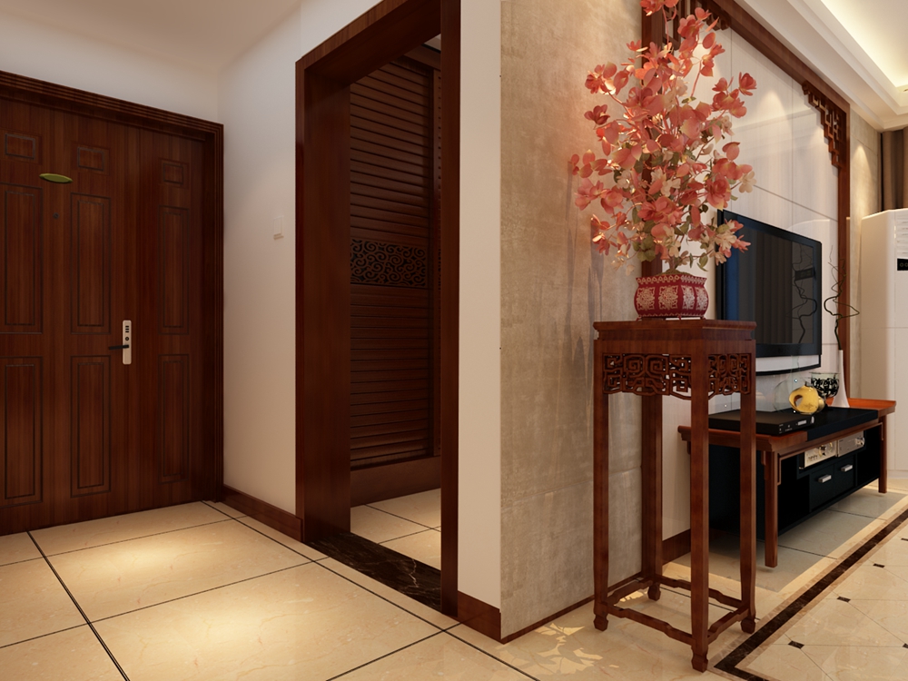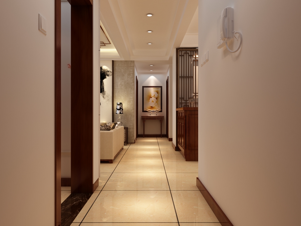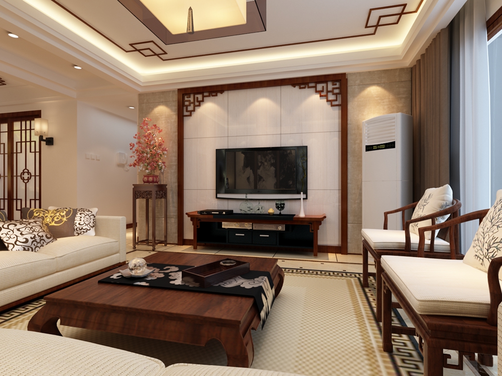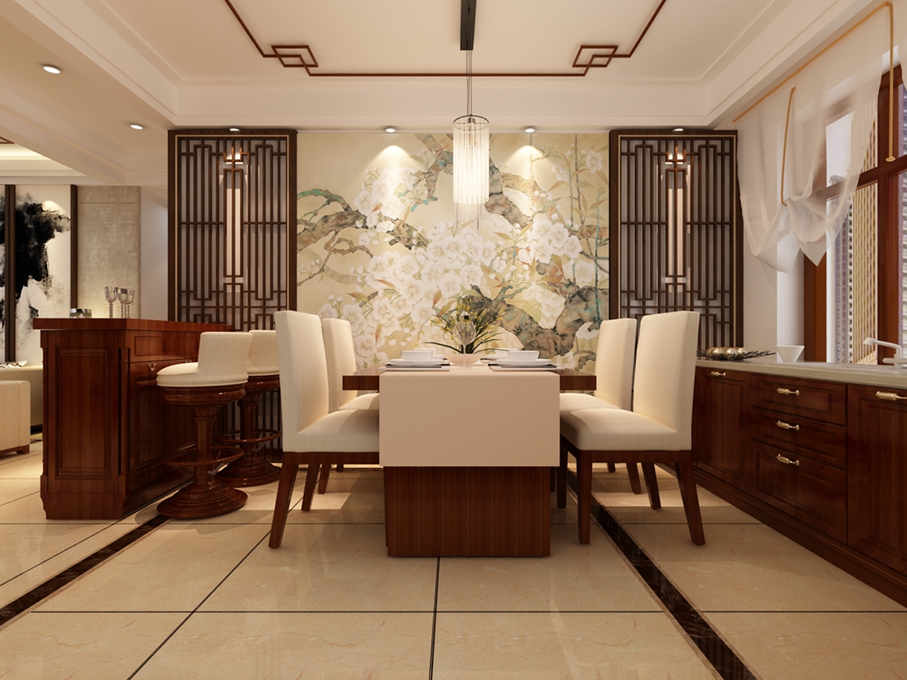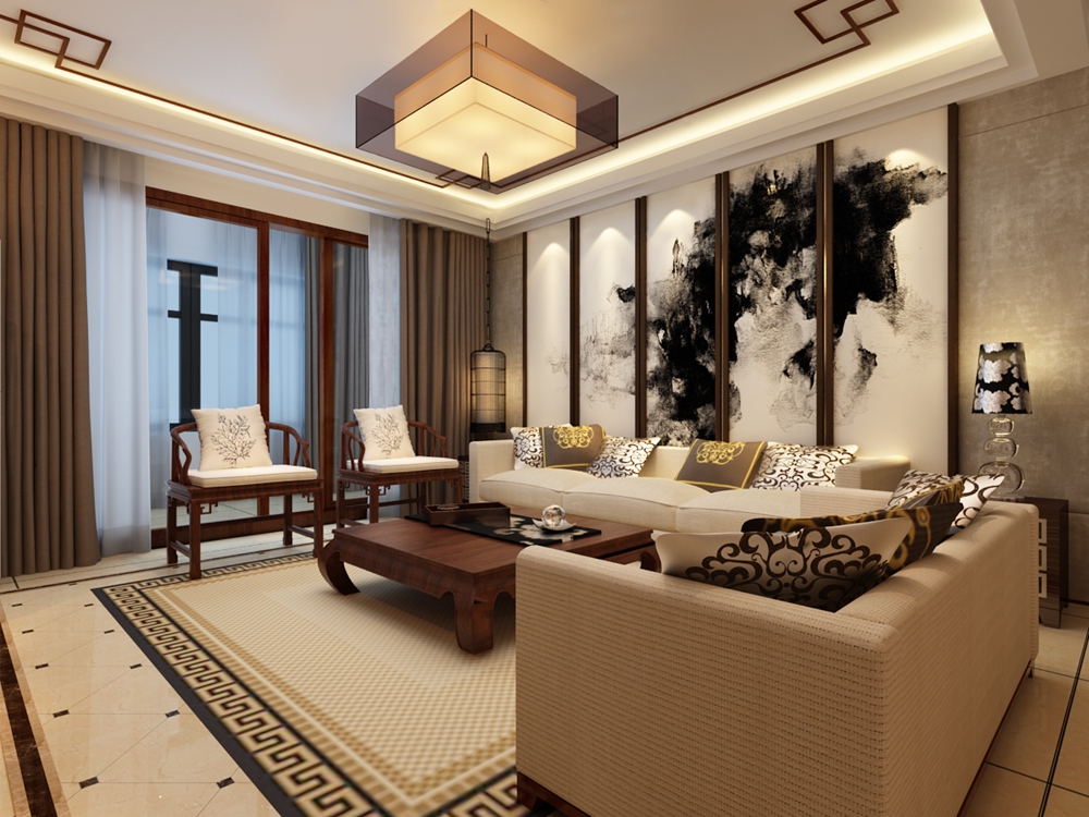 新中式风格大多数采用对称式的布局,用以营造清幽雅致的生活氛围,在装饰细节上崇尚自然情趣。在家具选配上,一般采用传统的圈椅,条案等中式家具去进行西式陈设,强调舒适性与实用性。在色彩上,通常以黑、白、灰色为基调,局部用红、黄、蓝、绿等进行点缀。在材质上,多采用榆木,橡木等硬质木材进行加工,用来表现东方文化的内敛气质。