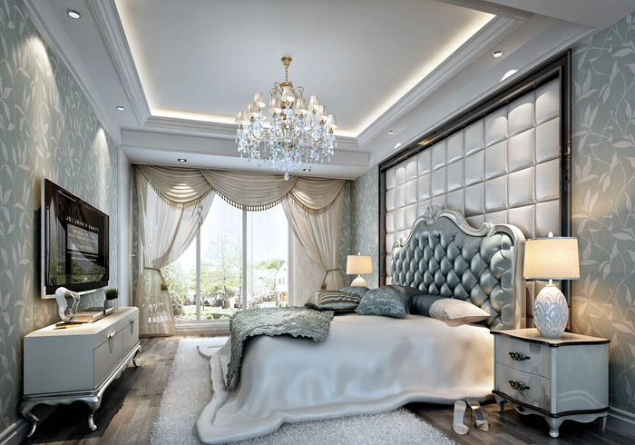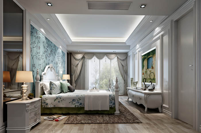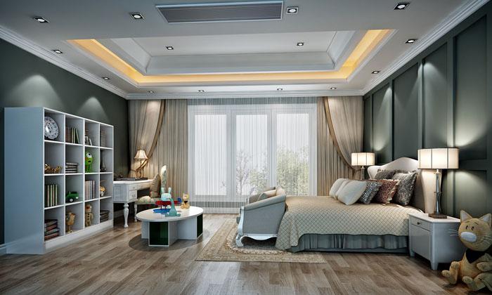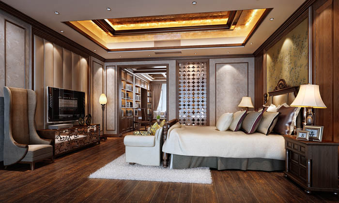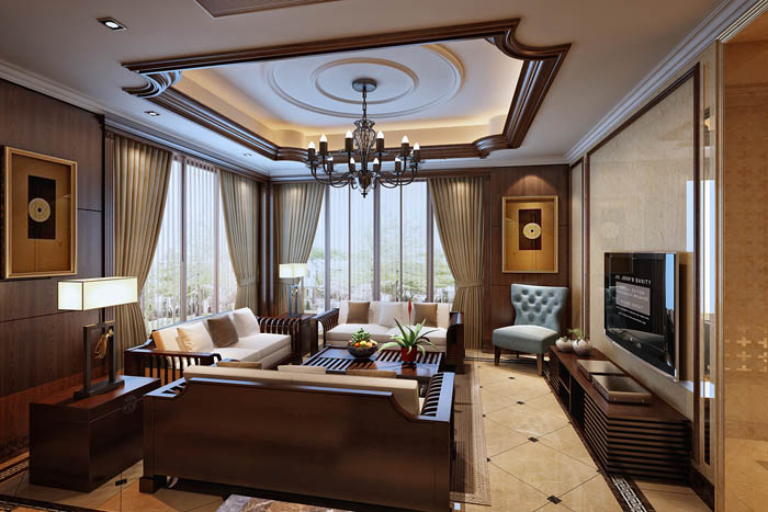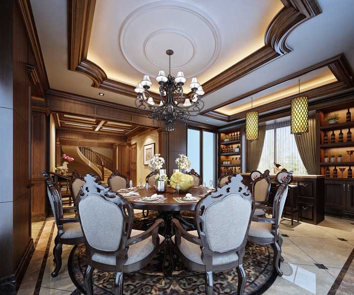 本套方案采用欧式与中式的的装饰风格, 客厅在墙板和玻璃采用了中式的纹样配上欧式的壁炉,灯具等在这个空间中体现得端庄,稳重。主卧的花鸟画墙纸给整个深色的基调的空间一片温暖。洒吧区顶部用木制格栅与草编墙纸的搭配显得整个空间轻松了许多。孩子房间都以他们喜爱的风格、颜色为定。
