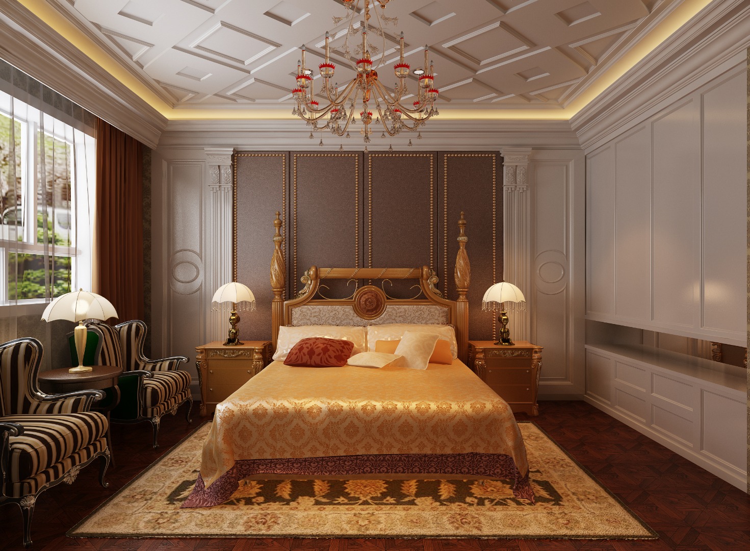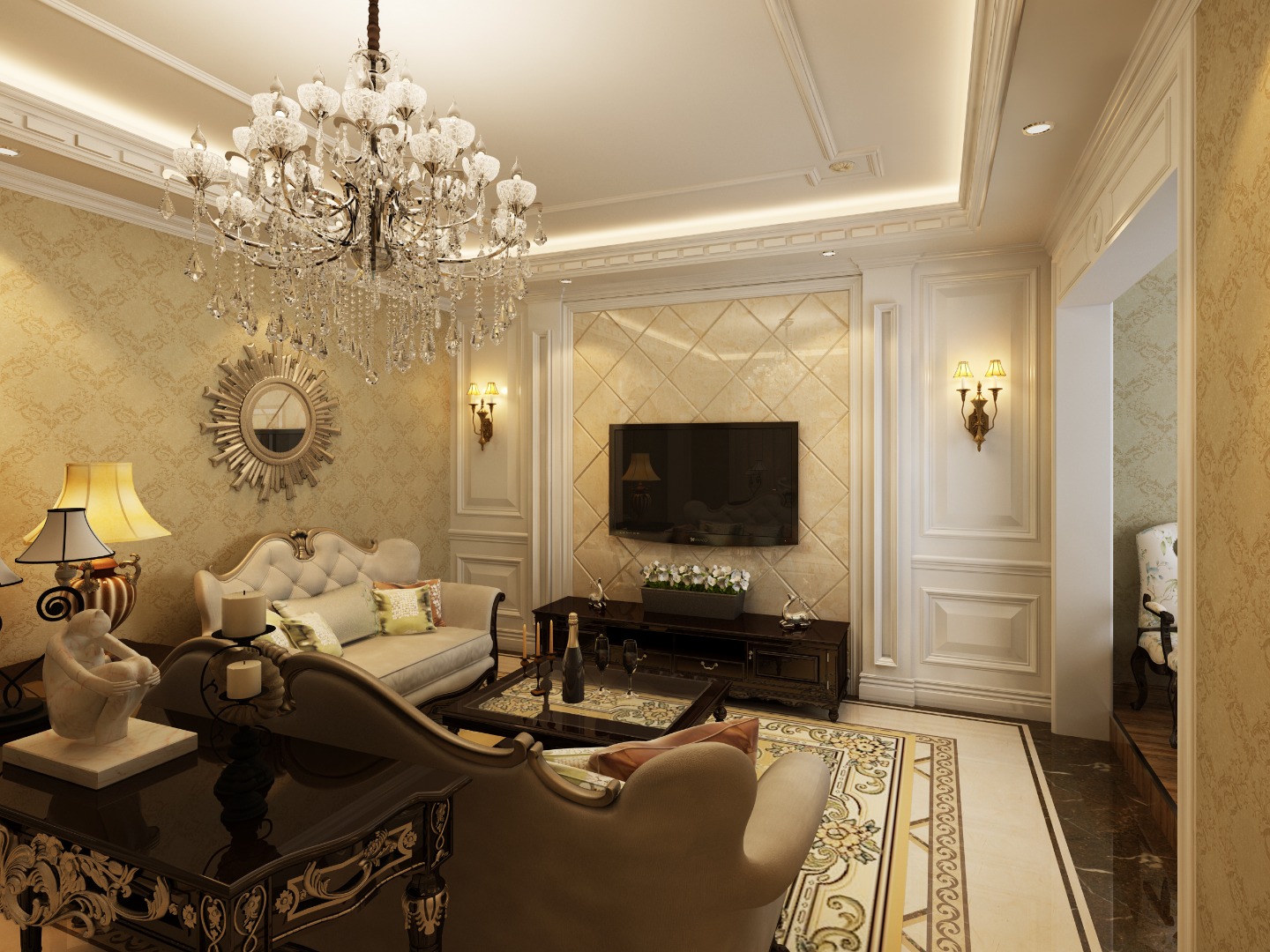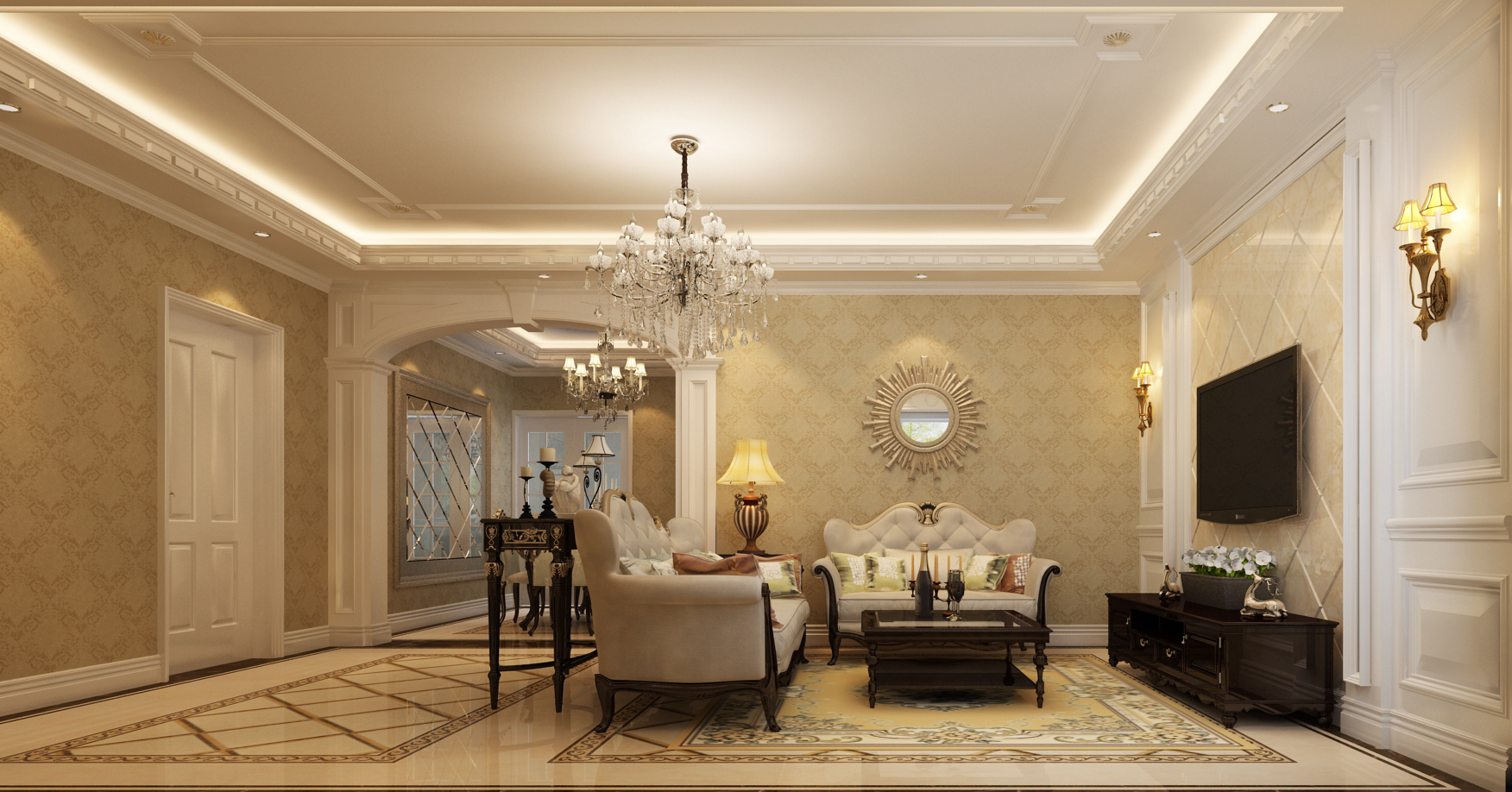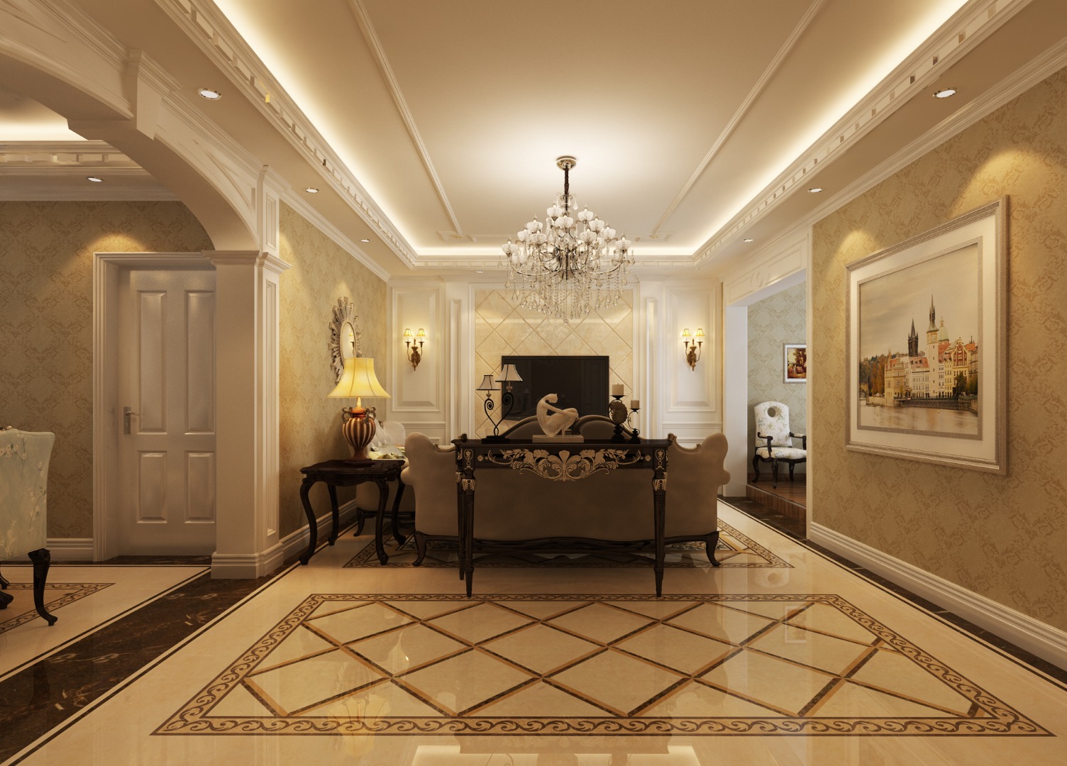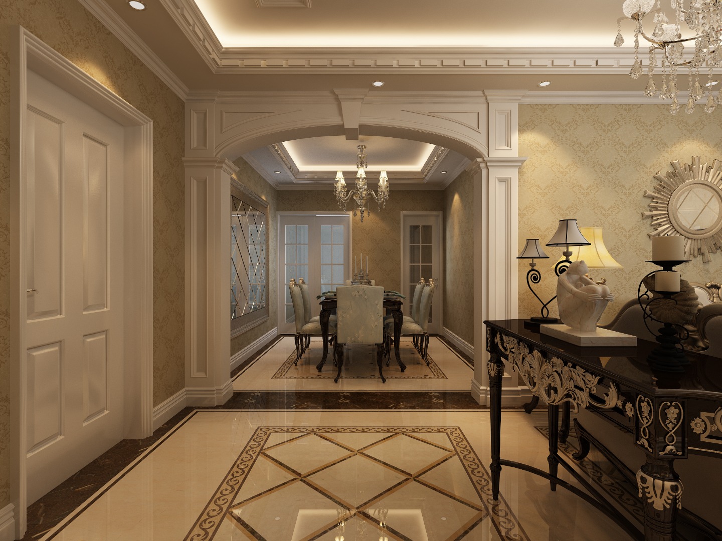 欧式风格不是一种风格,而是一种生活态度,本案设计中将木色和米色完美结合,家加上地面拼花和仿古砖的配合,高档温馨,宽敞富气。搭配成品木色的家具,保留了古典家具的色泽和质感的同时,又适应现代生活空间。起居室等空间,以功能性和实用舒适性为重点,用质地柔软温馨的成套布艺来装点,色调缓和给人很舒服的感觉。