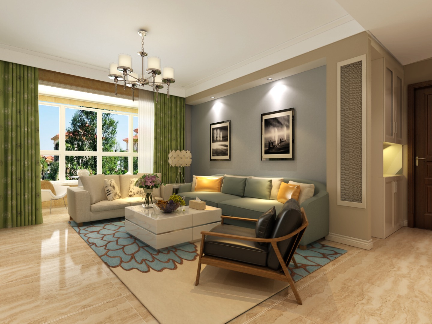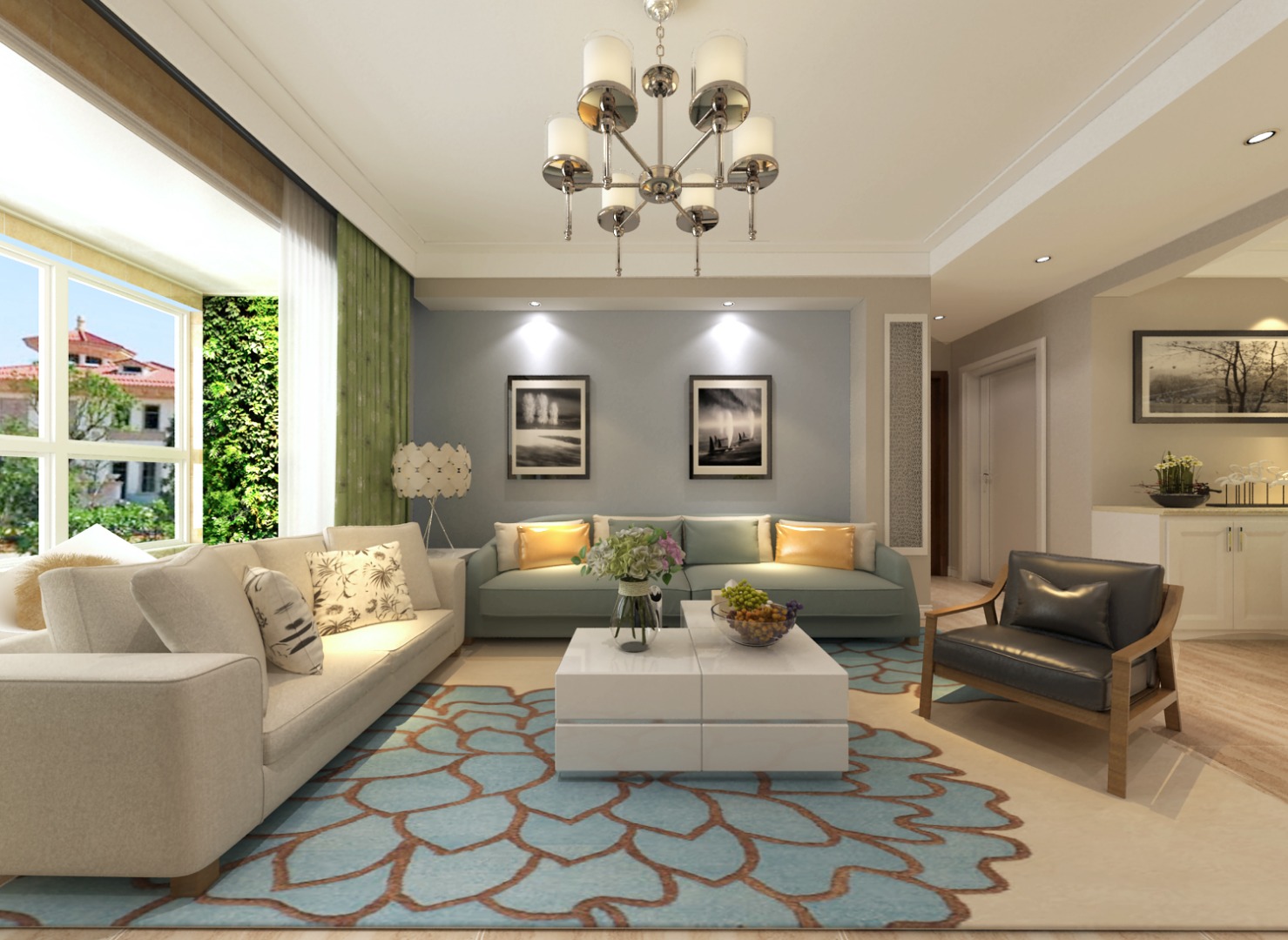 本设计使用大面积蓝、绿色调,仿佛身处森林之中,整体风格表现出怡然自得而舒适惬意的生活情趣。该案用合理的方式将空间进行了明确的划分,加上室内绿植的精心点缀,充分彰显出居住者的品味、爱好和生活价值观。