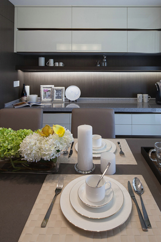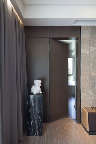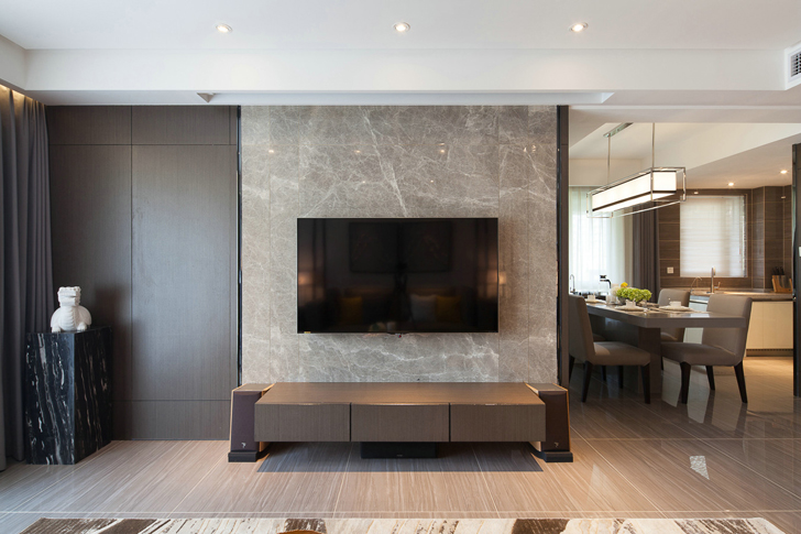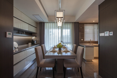 入户设计鞋柜,便于日后生活便利,门厅尽头设计衣帽柜,进门处理运用隐形门设计手法,使得过道端景一体性。侧面设计洗衣房,置顶移门便于空间规划和美观性,暗藏式空间使得空间一体性能统一。电视背景墙满铺大理石造型运用梯形方式处理方式,突破传统平面满铺大理石,过于死板。沙发背景运用毛石板中和下黑色大理石的刚硬感,内嵌黑色的烤漆不锈钢条,灰黑色搭配使得沙发背景轮廓醒目又不呆板。餐厅设计中岛台集合餐厅设计,增添操作空间和拉伸餐桌长度,使得空间的纵深感加强,墙面运用黑色的烤漆玻璃,镜面反射能有效的在视觉上拉伸空间视觉。主卧室床头造型设计黑色的门板储物柜,很好的把原本八角的空间规整又增加了储物空间
